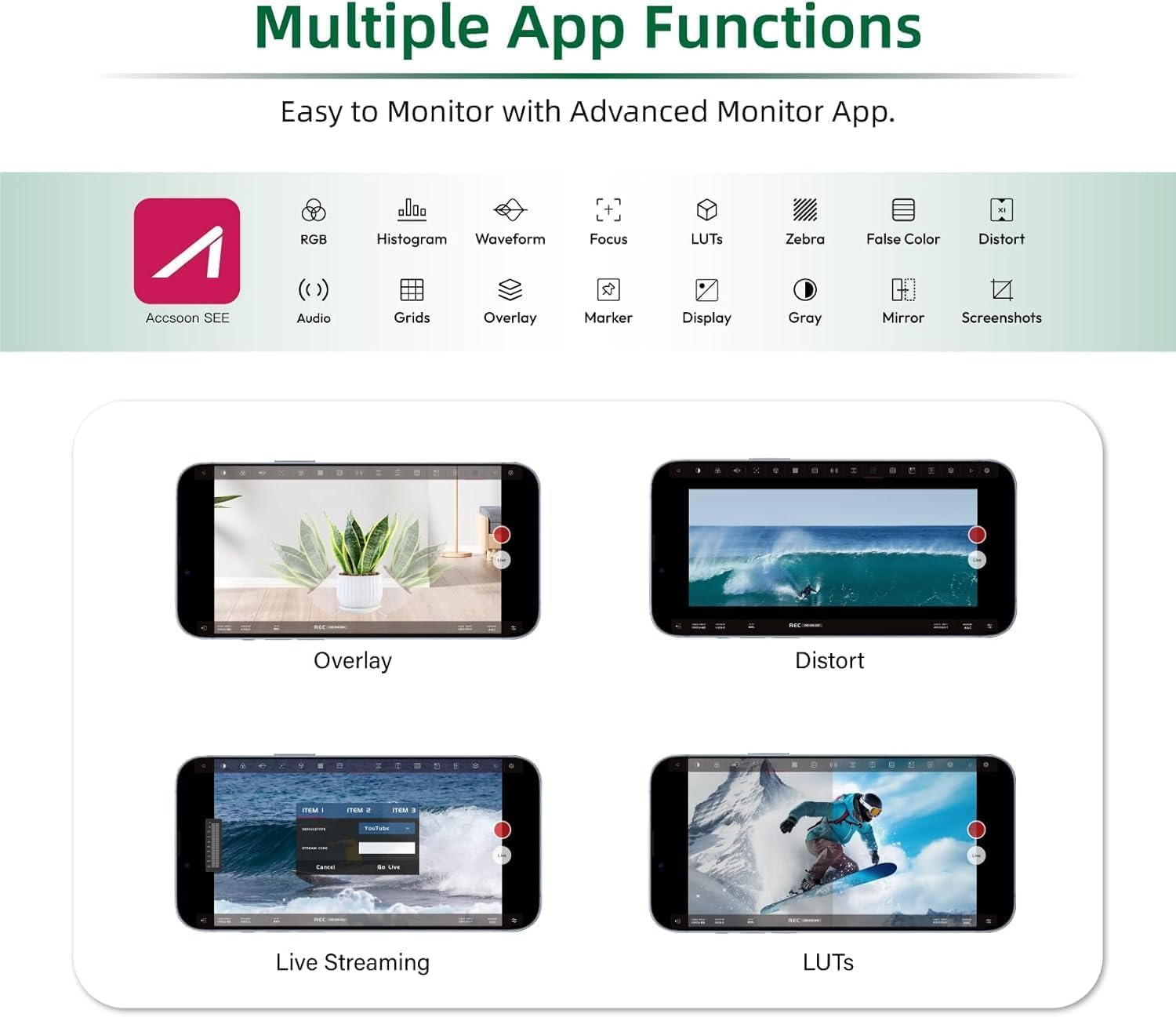 - Professional Monitoring & RTMP Live Streaming: The CineView SE integrates seamlessly with the Accsoon SEE App, providing professional-grade monitoring tools such as RGB, Audio Level, Histogram, Waveform, Focus Peaking, LUTs, and more. It also supports RTMP live streaming, allowing direct broadcasting to platforms like YouTube, Facebook, and Twitch