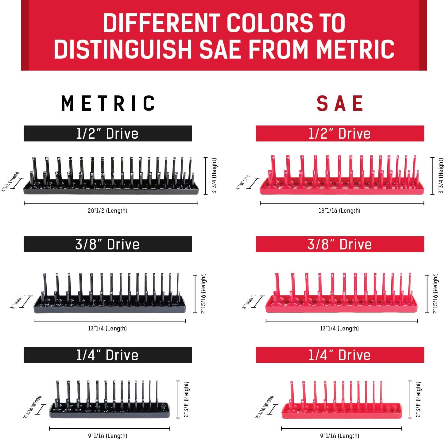 Keep your toolbox and workbench organized with the B&C Home Goods 76 Socket Organizer Set. This 6-piece tray set includes both SAE and metric measurements (3 red SAE trays, 3 black metric trays) to make identifying sockets quick and easy. Clearly labeled sizes and a color-coded system save time and reduce frustration during repairs. The trays feature an extra-large base for stability, preventing tipping while you work. Sizes include: 1/4" drive trays (1/8"-5/8” & 4-15mm), 3/8" drive trays (1/4"-1” & 6-20mm), and 1/2" drive trays (3/8"-1 1/4" & 10-27mm). Made from metal with a polished finish, these organizers are durable and reliable for home or garage use.