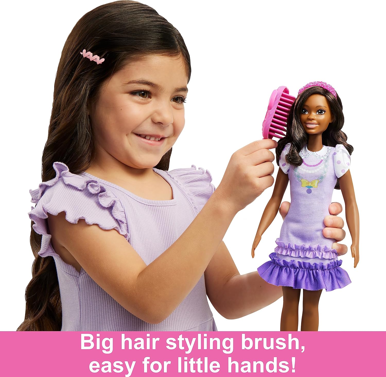 Barbie Mattel HLL20 Plastic Toy Doll Black Hair with Styling Brush, 1 Pcs (New, Damaged Retail Box)