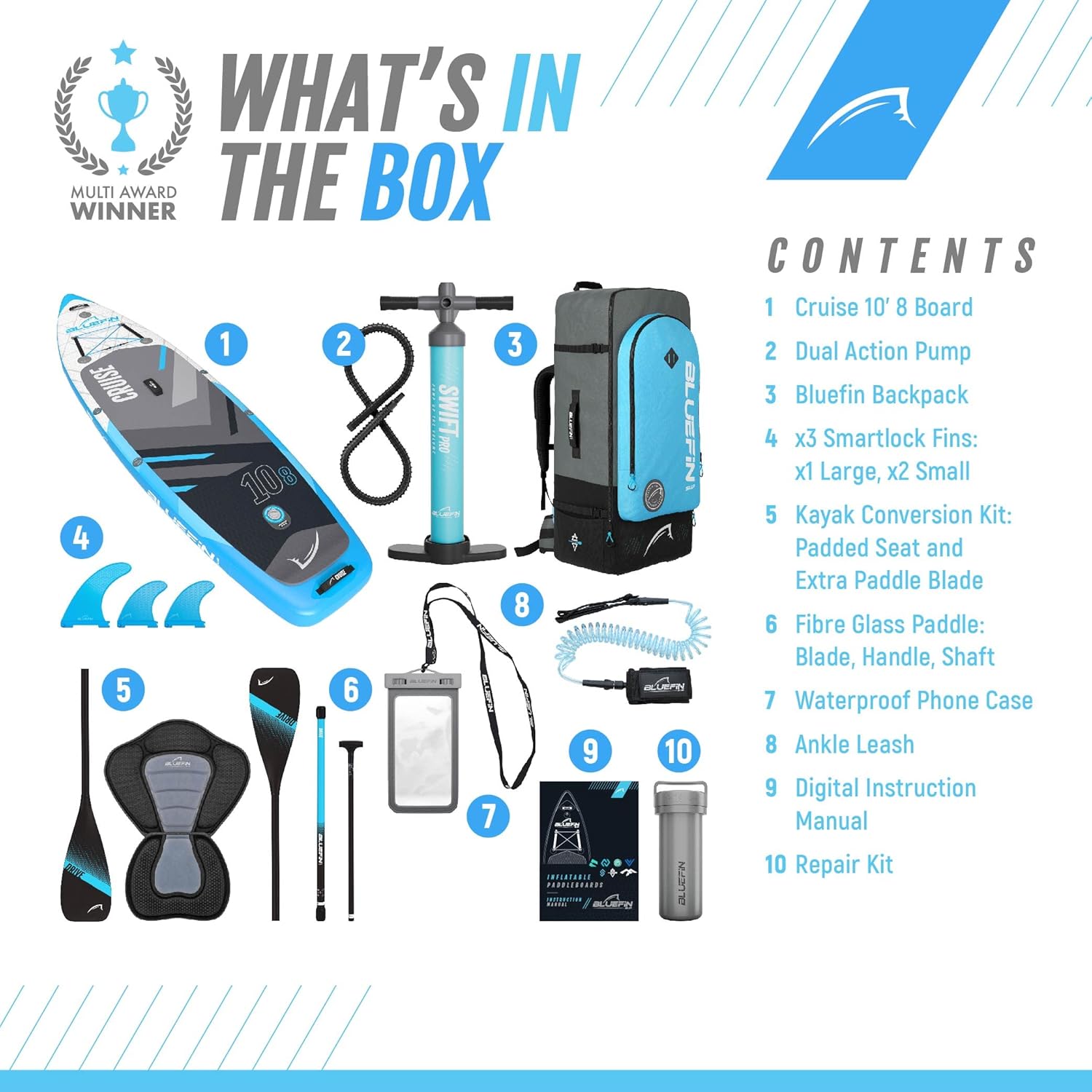 - AWARD-WINNING DESIGN. Bluefin uses ESL fused PVC and the densest drop-stitch on the market for the most reliable, stable & versatile Stand Up Paddleboards. This comprehensive Bluefin Cruise SUP package has been built by SUP lovers for SUP lovers.