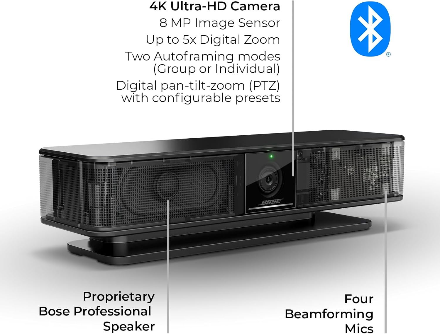 - All-in-One Video Conferencing Solution: Bose Professional's VB-S seamlessly combines a 4K Ultra-HD camera with 5x digital zoom, four Beamforming microphones for superior voice pickup, and a high-fidelity Bluetooth speaker for crystal-clear audio.