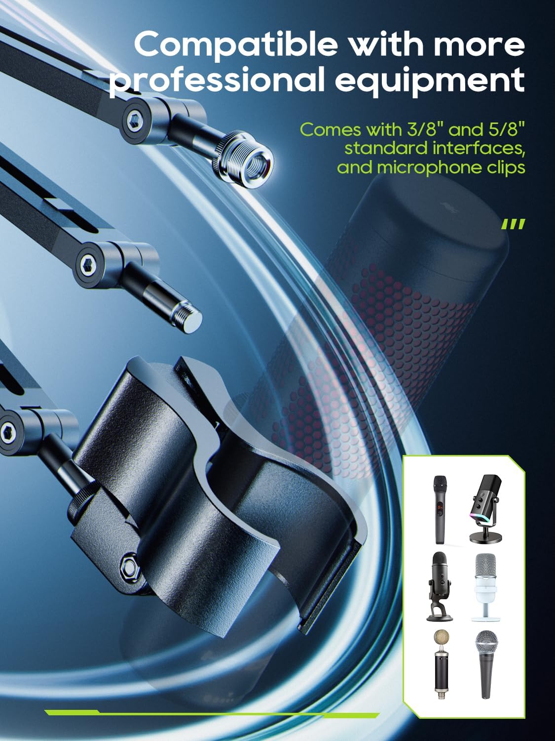 - Universal Compatibility: it comes with both 3/8''and 5/8" screw holes is compatible with any microphone and shock mount combination like Blue Yeti, Hyper X QuadCast, SoloCast, Blue Snowball, Shure SM7B, Shure MV7, AT2020, AT2020USB+, AT2035, ATR2500-USB, ATR2100-USB, Fifine AM8, etc. Perfect for studio, recording, podcasting, streaming, stage.