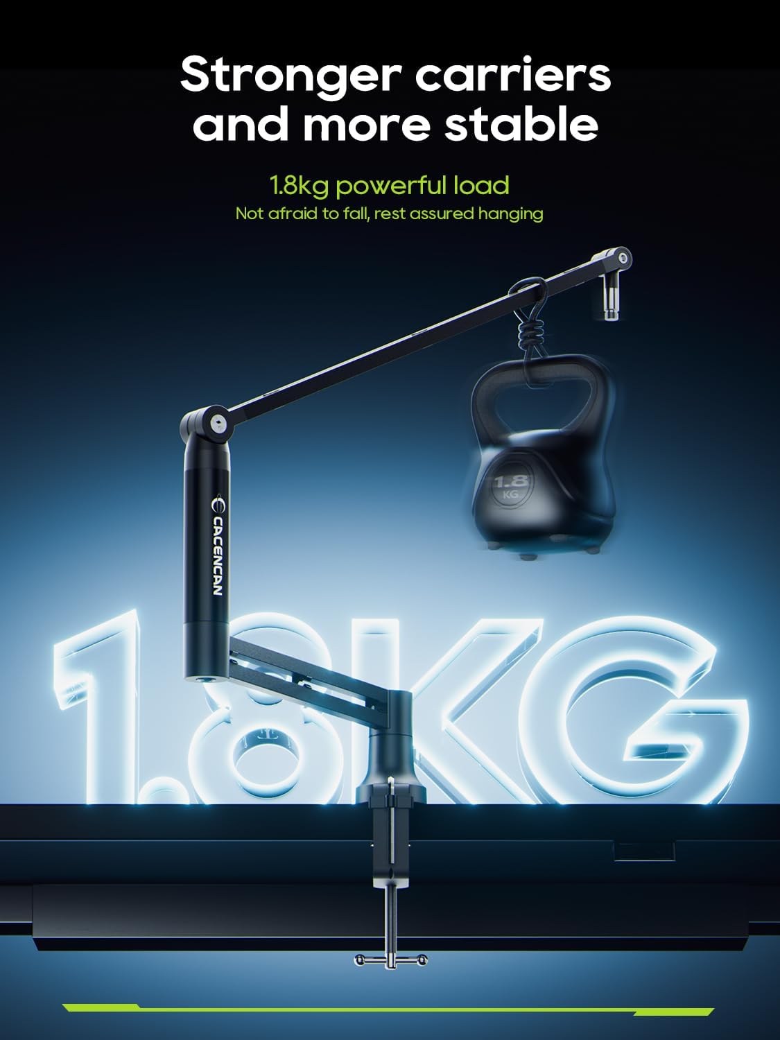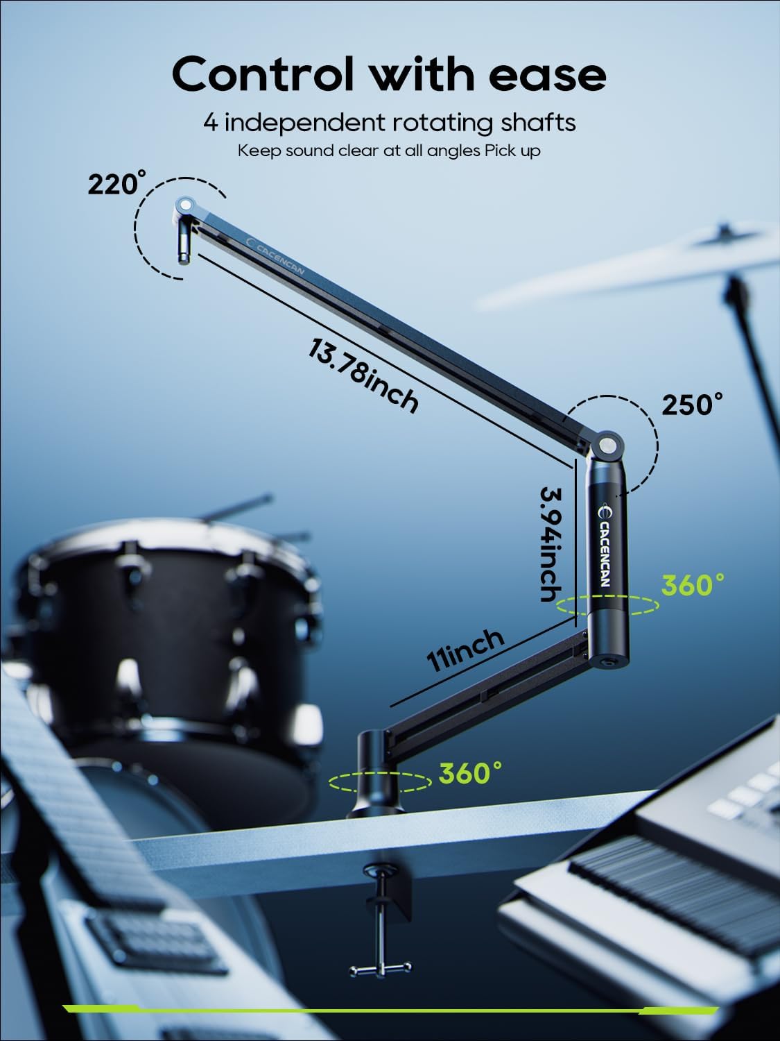 Upgrade your recording setup with the CACENCAN Microphone Stand Desk Boom Arm in . Built from durable aluminium alloy with a max load of 5.5 lbs (2.5 kg), it securely holds heavy mics like Blue Yeti, Shure SM7B, HyperX QuadCast, and more. The 9.8" extension rod and 360° adjustable arm allow flexible positioning without blocking your view. A reinforced 0.4mm thick C-clamp with silicone pad ensures stable mounting on desks up to 2" thick while protecting surfaces. Includes mic clip, conversion screw (3/8" & 5/8"), cable bands, and instructions. Dimensions: 7.48" x 2.76" x 17.32"; weight: 1 kg. Perfect for streaming, podcasting, and studio use.
