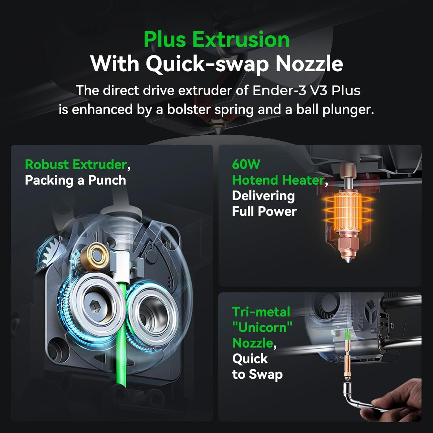- 【Robust Extruder & Packing a Punch】The direct drive extruder of creality 3d printer ender 3 v3 plus is enhanced by a bolster spring and a ball plunger. 1000h+* Clog-free Extrusion, it grips the filament tightly without slackening off. Side spring, bolstering the grip of extruding gears.Powder metallurgy lever, hard to deform, keeping the extrusion force.