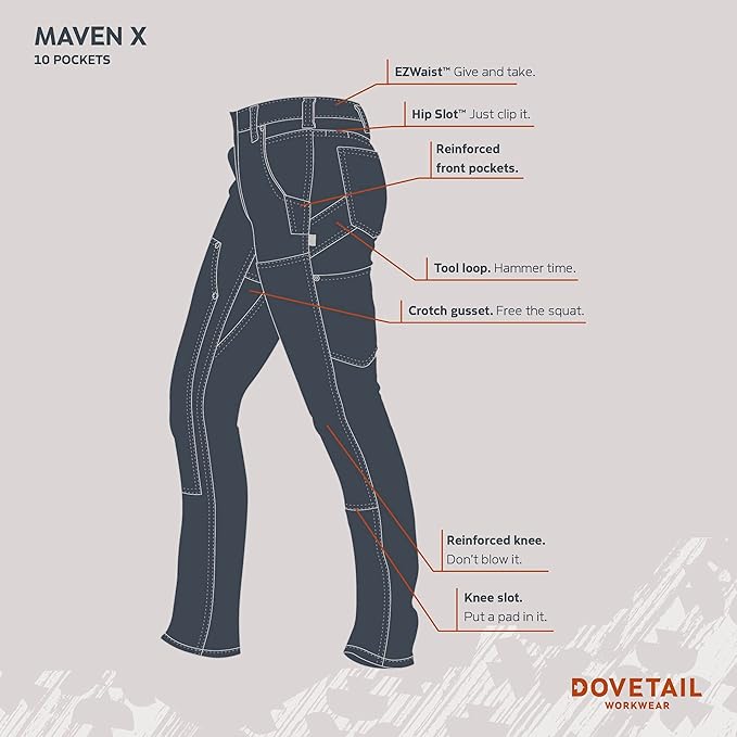 - THE X-FACTOR: Maven X is the next generation of our beloved Maven Slim workpant. Same fit. Same sweet slim-leg silhouette. A crotch gusset gives more mobility when you’re crouching or climbing or dangling, or riding. A hidden elastic waist means extra comfort. Reinforced front pockets double down on toughness.
