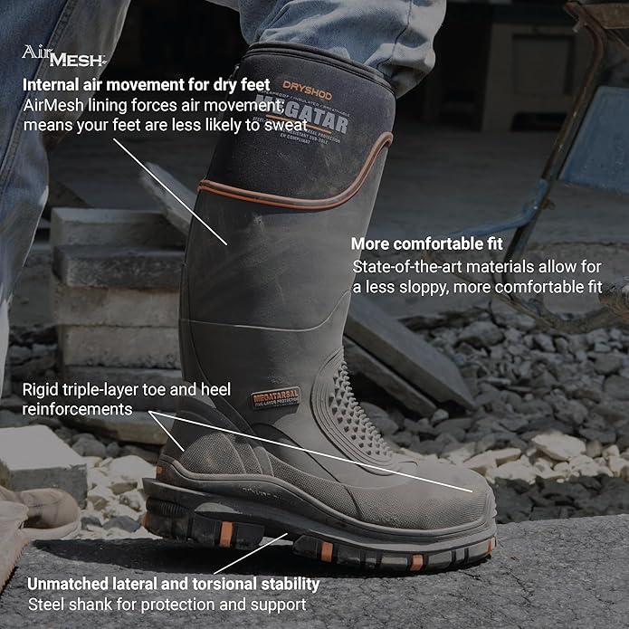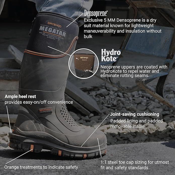 The Megatar From Dryshod Is A Work Boot Designed For Maximum Protection And Comfort In The Most Challenging Work Environments. From The Slip-Resistant, Full-Foot Csa-Approved Non-Metallic Puncture-Resistant Sub-Sole To The Genuine Hand-Laid Rubber Upper And Full-Length 5Mm Densoprene Insulated Foam Bootie, The Megatar Is Ready For Any Task.