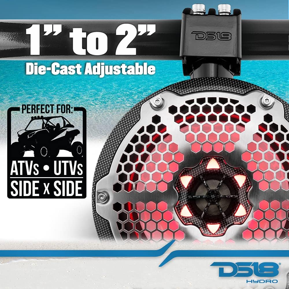Upgrade your sound with the DS18 CF-X8TP 8" Marine Tower Speaker, redesigned for 2021 to deliver louder, clearer audio with enhanced durability. Featuring 125W RMS / 375W MAX power handling and 4-ohm impedance, this speaker includes a passive woofer radiator for deeper bass and increased volume. Built with IP65 marine-grade, UV-stable PC+ABS enclosure and stainless steel mesh grille for long-lasting performance. Integrated RGB LED lighting illuminates the speaker, ring, and logo for a bold night look. Adjustable 360° die-cast clamps (1"–2") ensure secure mounting. High-gloss texture finish.