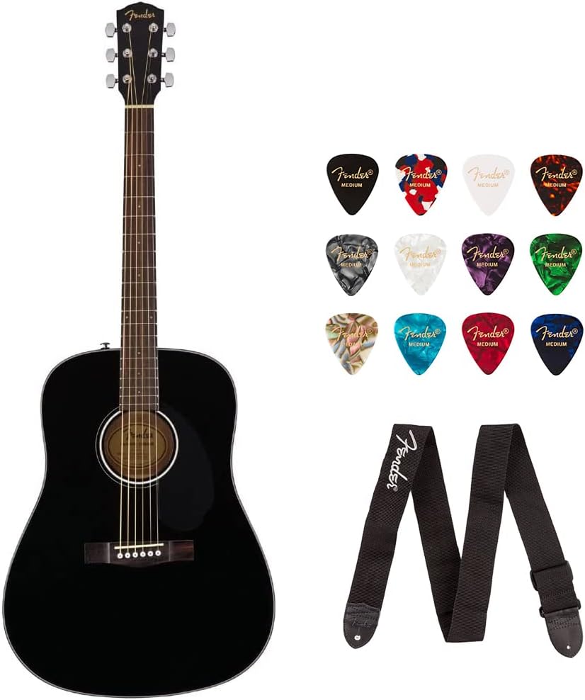 This Fender Dreadnought Style Acoustic Guitar is finished in Black and built for right-handed players. It features a premium tonewood combination: a Sitka Spruce Top paired with Mahogany for the body back and sides, giving it a classic, balanced sound profile. The internal Scalloped "X" Bracing enhances resonance. The Mahogany Neck has a comfortable 25.3-inch Scale Length and is fitted with a Walnut Fingerboard featuring Easy-to-Play Rolled Fingerboard Edges for smooth movement up the neck. Hardware includes Chrome Die-Cast Tuners and a Walnut Bridge. The soundhole is adorned with a CD Series Pearloid Rosette. This is a 6-string steel-string acoustic Guitar that consists of a of Fender Classic Celluloid Guitar Picks and a Fender Strap. Note: Case is not included.