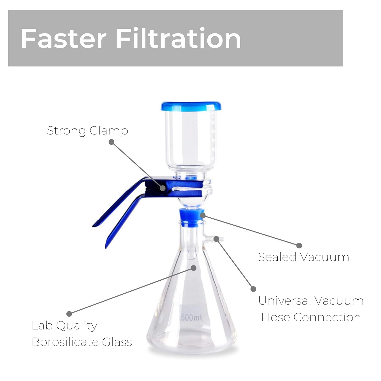 - EASY TO USE: The kit can be set up in minutes and is easy to disassemble, clean and store. The 2000mL filtering flask can handle larger jobs. The 300mL graduate funnel allows for easy measurement, unlike most Buchner funnel apparatuses. Best used with 50mm membrane filter paper.