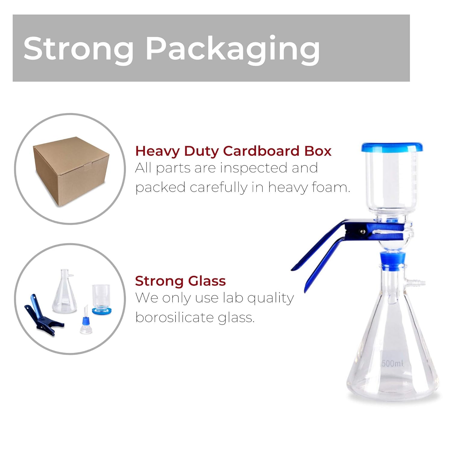 - PURE SOLUTIONS: The filtering lab flask can be used to separate components or impurities in your mixtures or solutions. The filtration apparatus is built to last with tough, heat resistant borosilicate beaker glass designed to handle boiling liquids and strong vacuums. The glass is packaged tightly and thoroughly inspected to guarantee you receive an unblemished product.