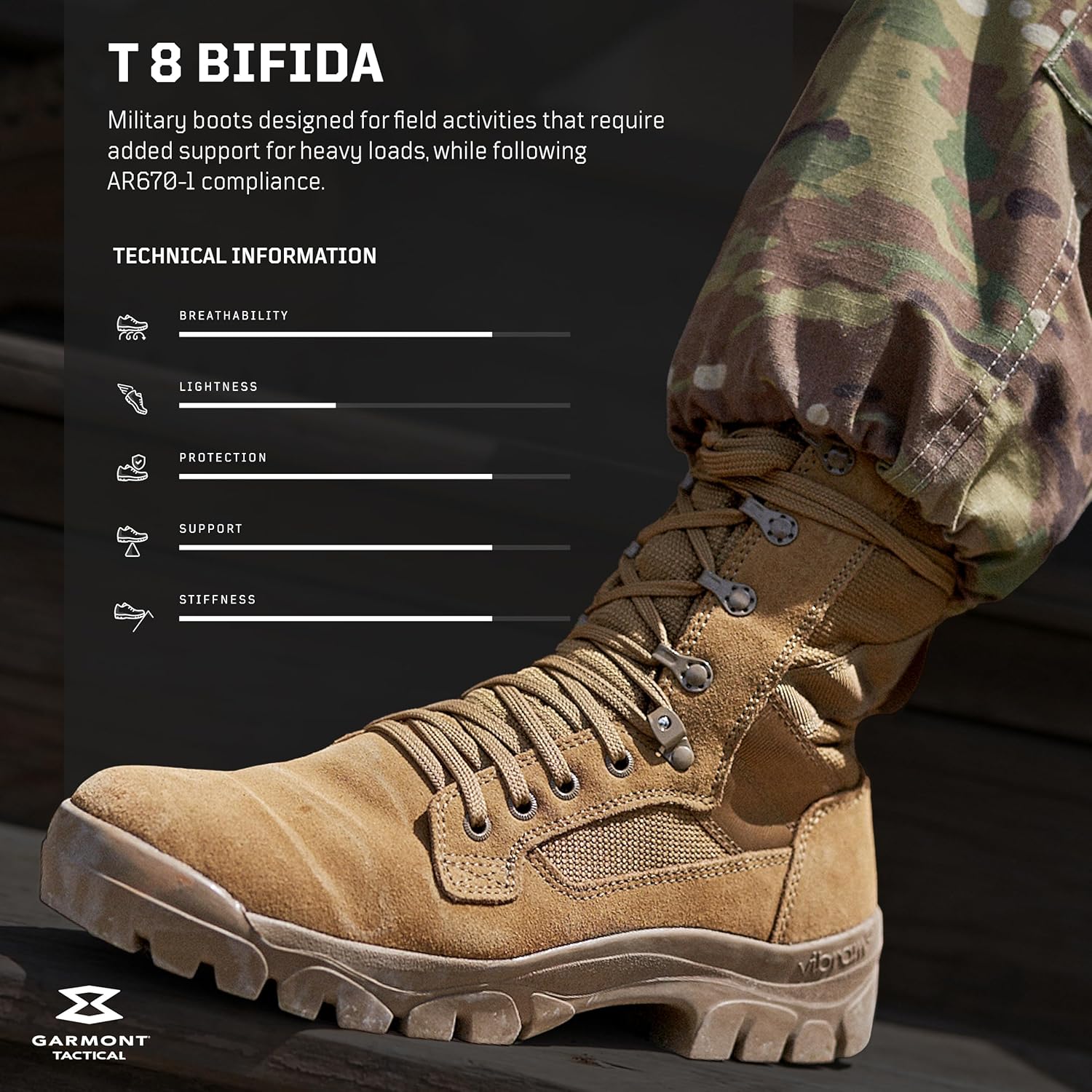 GARMONT T8 Bifida tactical boots deliver lightweight, durable performance on all terrains. Made with suede leather and polyester, featuring Ortholite Ultra footbed, waterproof construction, speed-lacing system, and AR 670-1 compliance. Comfortable, supportive, and ideal for work or military use.