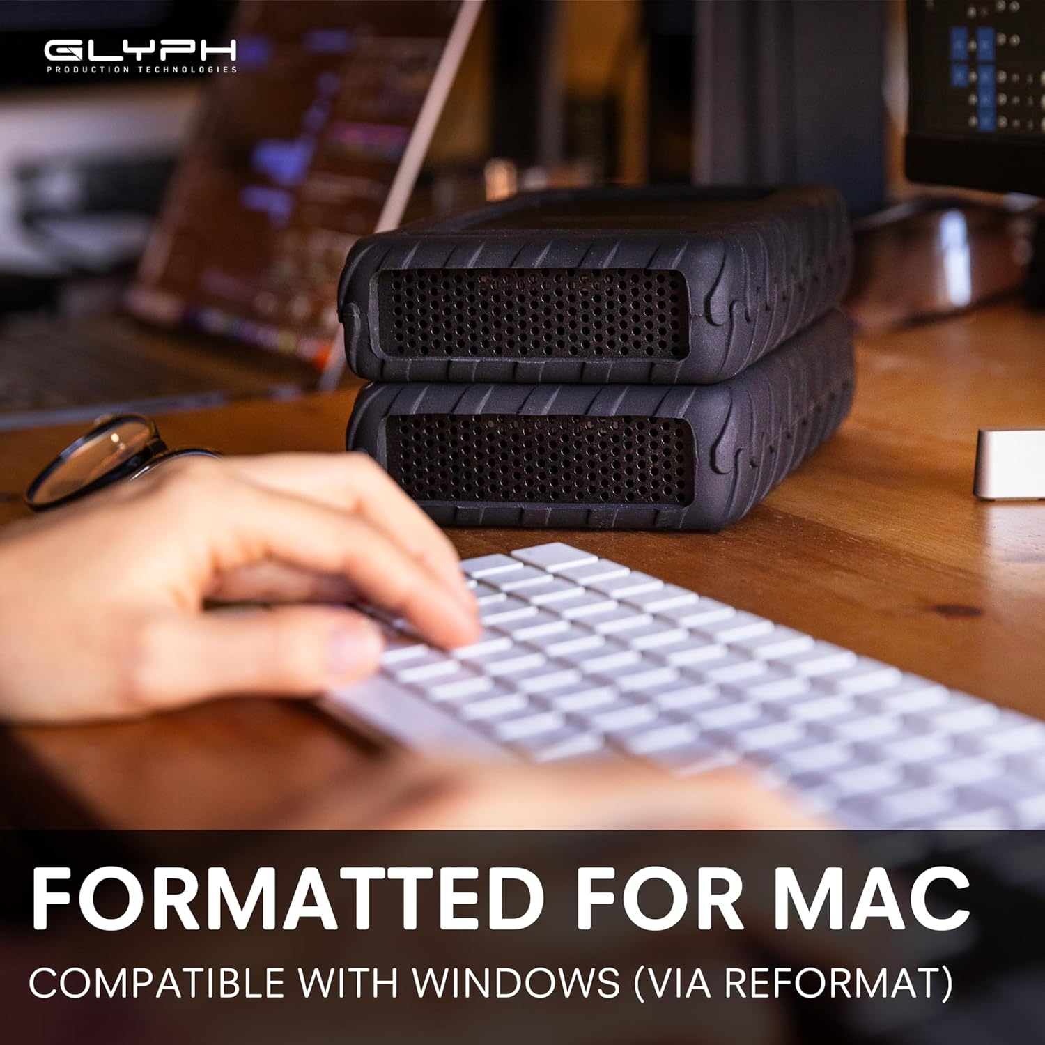 The Glyph Production Technologies BBPR8000 is an External Hard Drive offering a high Digital Storage Capacity of 8 TB for video editors, photographers, and creative professionals. This Black drive features USB-C 3.2 Gen 2 connectivity, delivering 10 Gbps bandwidth for fast file access (Data Transfer Rate: 260 Megabytes Per Second) and a Hard Disk Rotational Speed of 7200 RPM. Designed for enterprise workloads, it features a rugged aluminum shell and active fan cooling for reliable 24/7 use. It comes Mac-ready out of the box and is easily reformattable for Windows or Linux. It is compatible with Camera, Desktop, Gaming Console, and Laptop devices. The drive includes both USB-C and USB-A cables, an integrated power supply. The unit weighs 4.6 Pounds and is 44.45 Millimeters high.