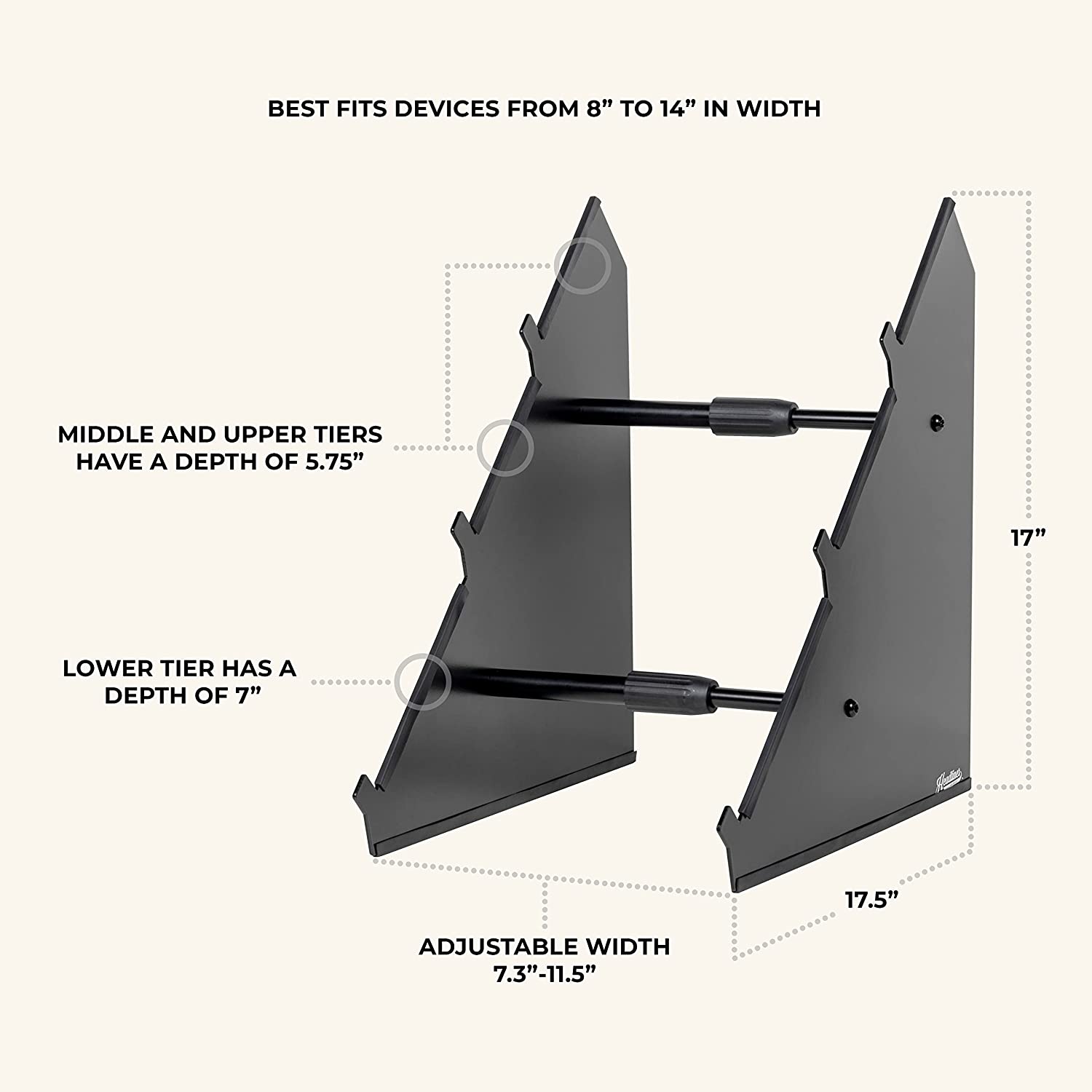 The Headliner 3-Tier Desktop Synth Stand was designed to improve your workflow and help you stay organized while fitting more gear on your production desk. It fits three compact devices like synthesizers, controllers, drum machines, and effects modules. The angled design makes it easier to reach knobs and view LCD screens. The Headliner 3-Tier Desktop Synth Stand is adjustable in width from 7.3” to 11.5” and fits a variety of devices from Roland, Korg, Elektron, and more (partial list below). It is made from solid steel and includes non-slip rubber strips for added stability. Features. Improve your workflow and stay organized while fitting more gear on your production desk. Fits three devices such as synthesizers, controllers, drum machines, and effects modules. Angled stand makes it easier to reach knobs and view LCD screens. Solid steel construction with non-slip rubber strips keep stand and equipment in place. Width adjustable from 7.25” to 11.5”. Best fits devices from 8” to 14” in width. The lower tier has a depth of 7”. The middle and upper tiers have a depth of 5.25”. Overall dimensions of stand (WxDxH): 7.25”-11.5” x 17” x 17.5”. Includes non-slip rubber strips. Fits*: Akai Fire, Alesis SR-16, Arturia SparkLE, Behringer Crave, Behringer TD-3, Behringer RD-6, Elektron Digitone, Native Instruments Maschine Mikro MK3, PreSonus ATOM SQ, Akai LPD8, Akai MPX8, Dreadbox Typhon, Korg nanoPAD2, Korg SQ-1, Korg Volca Bass, Korg Volca Beats, Korg Volca Drum, Korg Volca Kick, Korg Volca NuBass, Korg Volca Sample 2, Roland Boutique Series, Roland MC-101, Roland TB-3 Touch Bassline, Roland TR-6S *Some devices may not fit on all tiers.