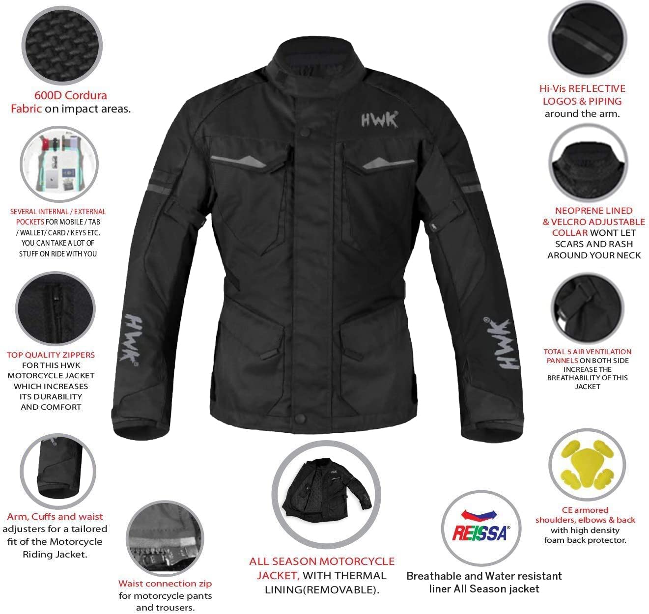 - Use Confidently. Motorcycle riding jacket with a micro mesh fabric and Reissa water resistant membrane, five airflow ventilation panels, and a removable thermal lining is great for every weather and season