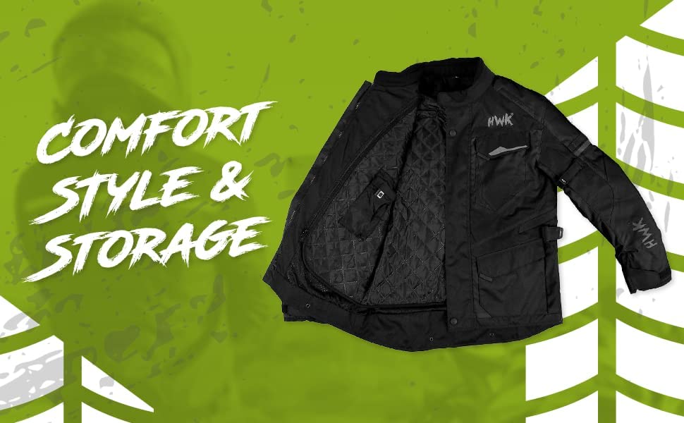 - High Visibility. Reflective HWK logos on the chest and wrists keeps the rider visible in dark conditions. 3-color contrast HWK design with bright and bold colors pop on the hi vis green and light gray jackets