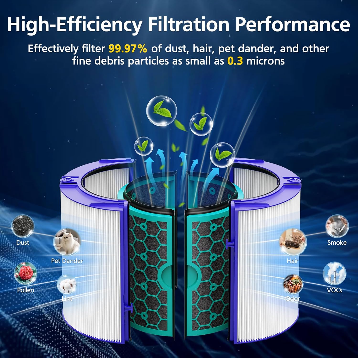 - 【H13 True HEPA Filter】Using genuine HEPA technology filter, it can capture 99.97% of tiny particles as small as 0.3 microns, including pet dander, pollen, and dust. Meanwhile, the activated carbon filter effectively absorbs household odors such as cigarette smoke, pet odors, and cooking fumes.
