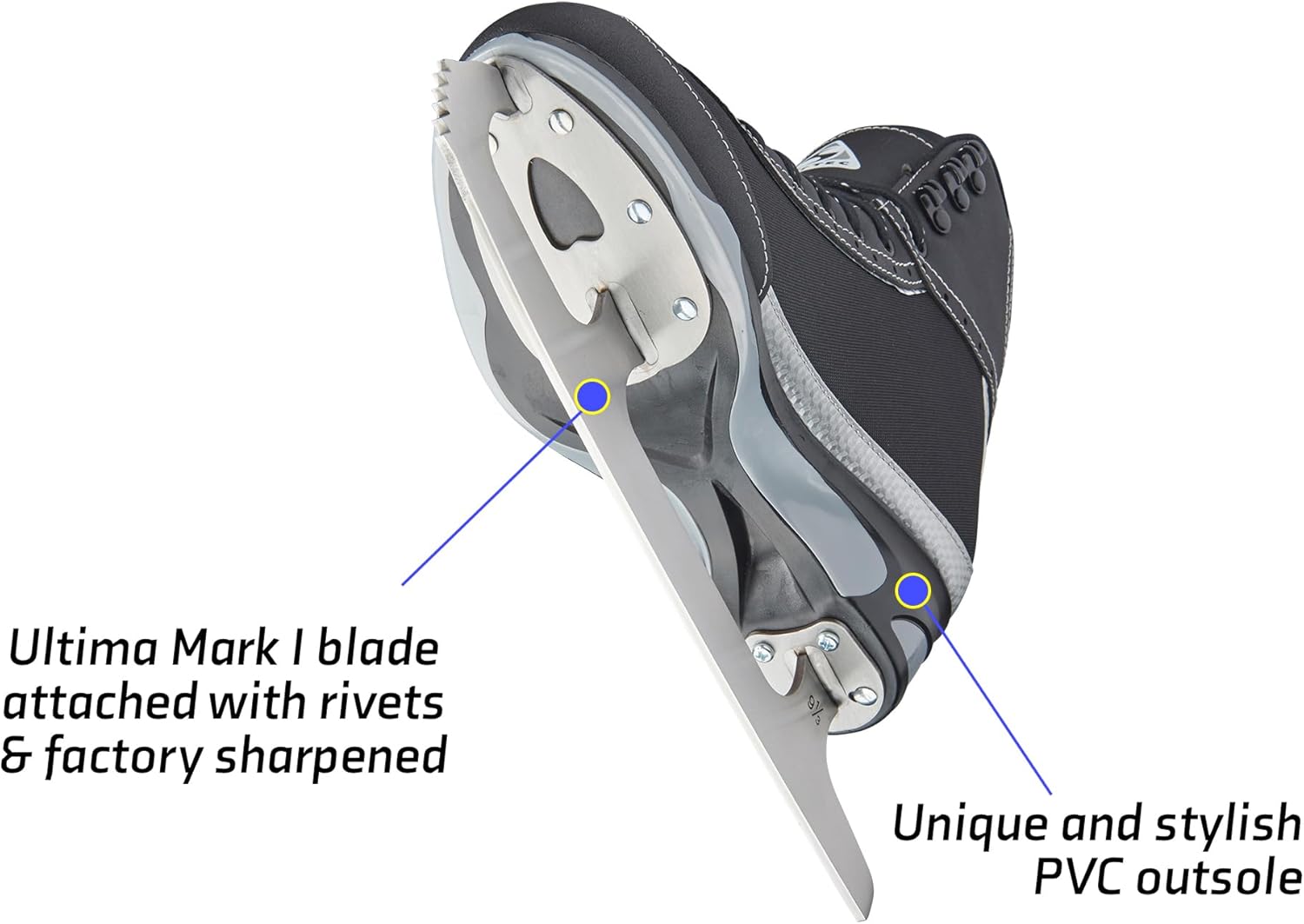 - Factory-sharpened Ultima Mark I stainless steel blade is ideal for beginner figure skating. Attached to the PVC sole with rivets for better security. Perfect ice skates for women and kids' ice skates for learning how to skate. Quality and stability are provided in ice skates for kids.