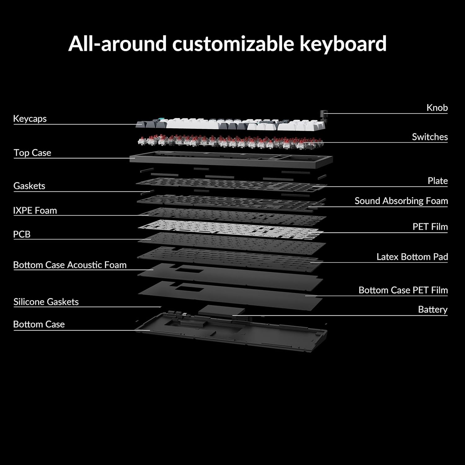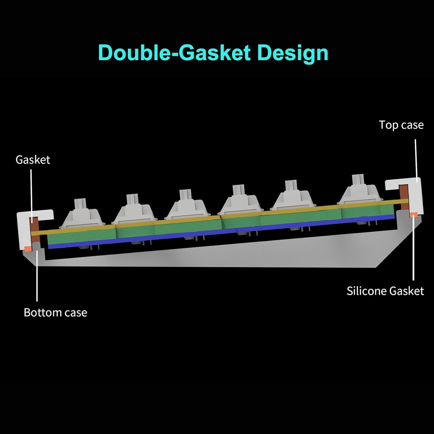Enhanced Acoustic Foams: we elevate the typing experience with a combination of premium acoustic foams such as IXPE, PET, and Latex. Each keystroke becomes enjoyable, making every tap a delight for the senses - Double-Gasket Design: The Double Gasket Design is a new innovative structure in the industry. In addition to the gaskets on the plates, we added silicone pads between the top and bottom cases to significantly reduce the acoustic resonance between the metals and reduce the noise of the impacted metals