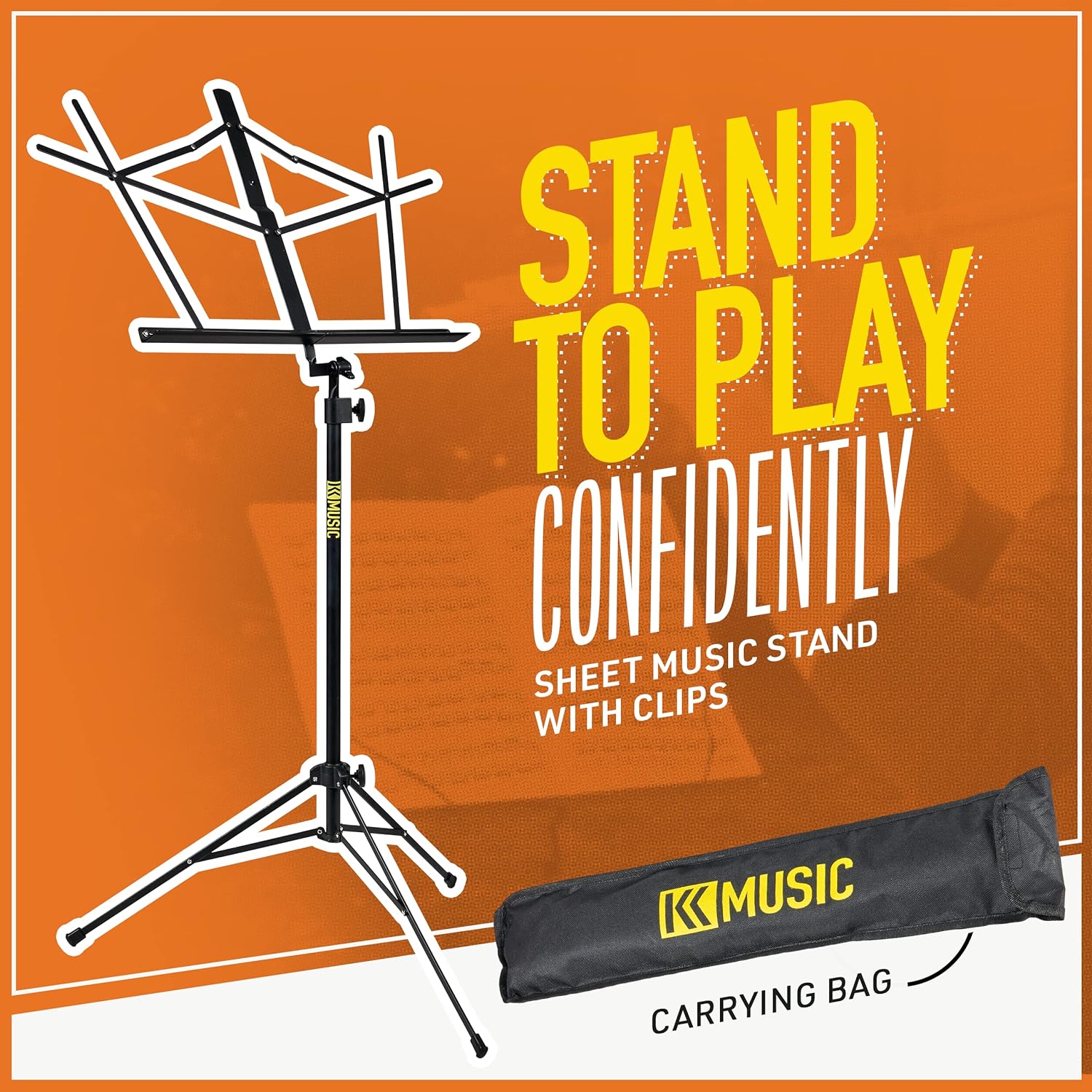 With a simple yet modern design, this music stand fits everywhere. From in classroom settings all the way to big orchestral performances on stage! Hold your sheet music steady in band class or orchestra class, practicing at home, or during a recital or outside concert. Always keep the music in your line of sight – simply adjust the height to accommodate your perfect practice or performance stance. This versatile music stand can extend tall for standing performances and low for seated ensembles. The stand is made of slim black metal, so it’s light and easy to fold up and carry. Plus, the KK Music sheet music stand comes with its own carrying bag with a handle to make it even easier. Just throw it over your shoulder and get to practice or your next gig!