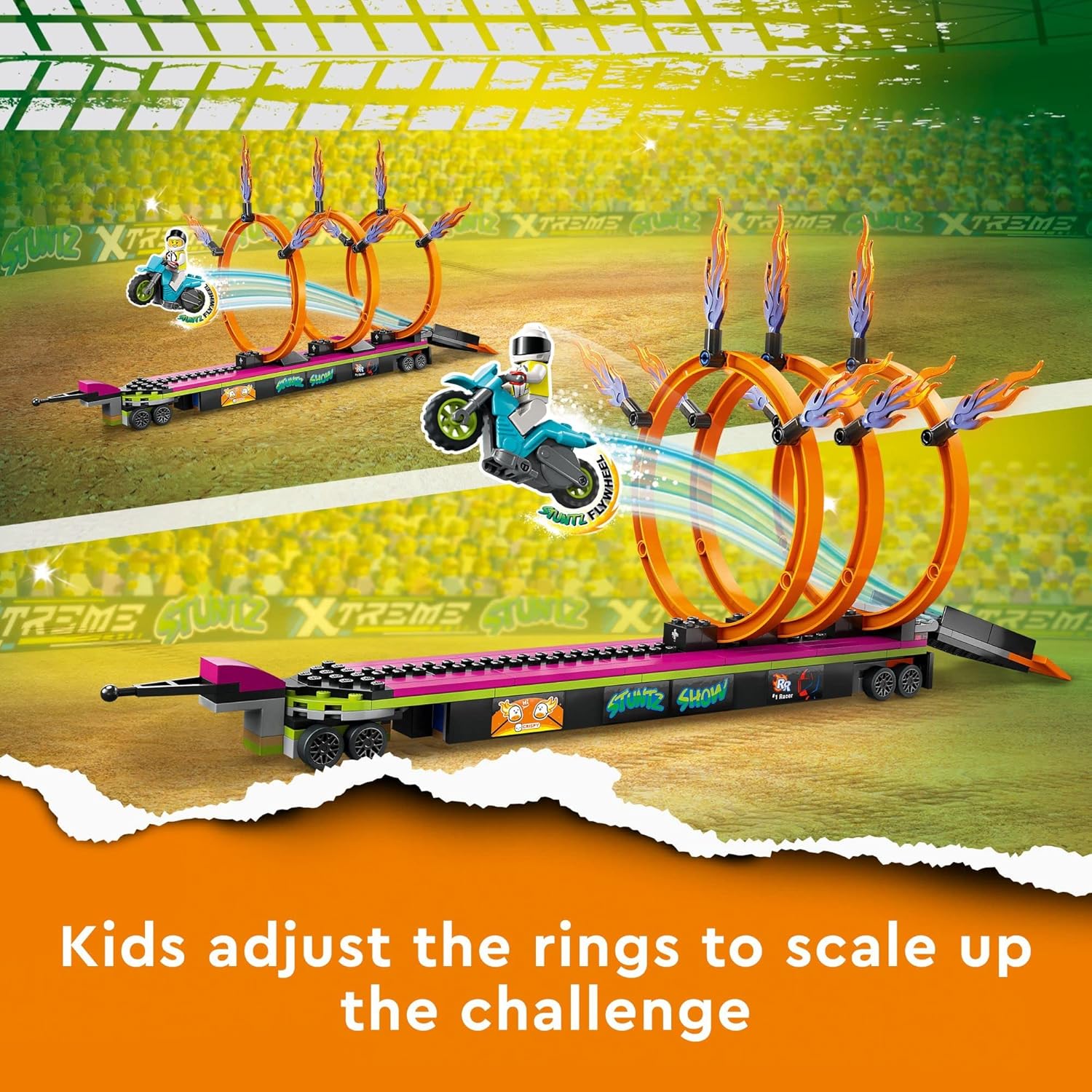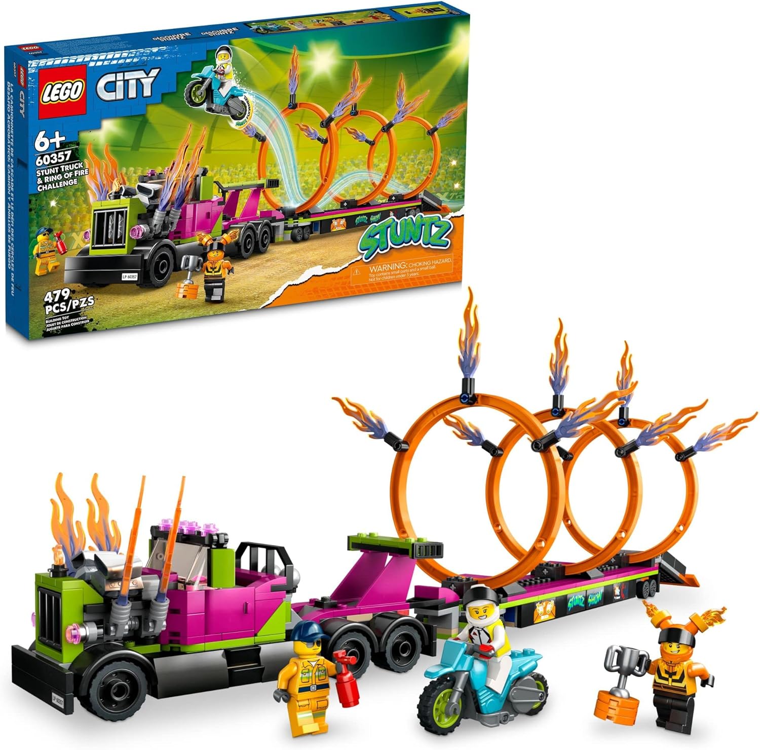 - Kids can put on the ultimate Stunt show with this LEGO City Stuntz set including a toy truck, rings of fire, toy motorcycle and 3 minifigures