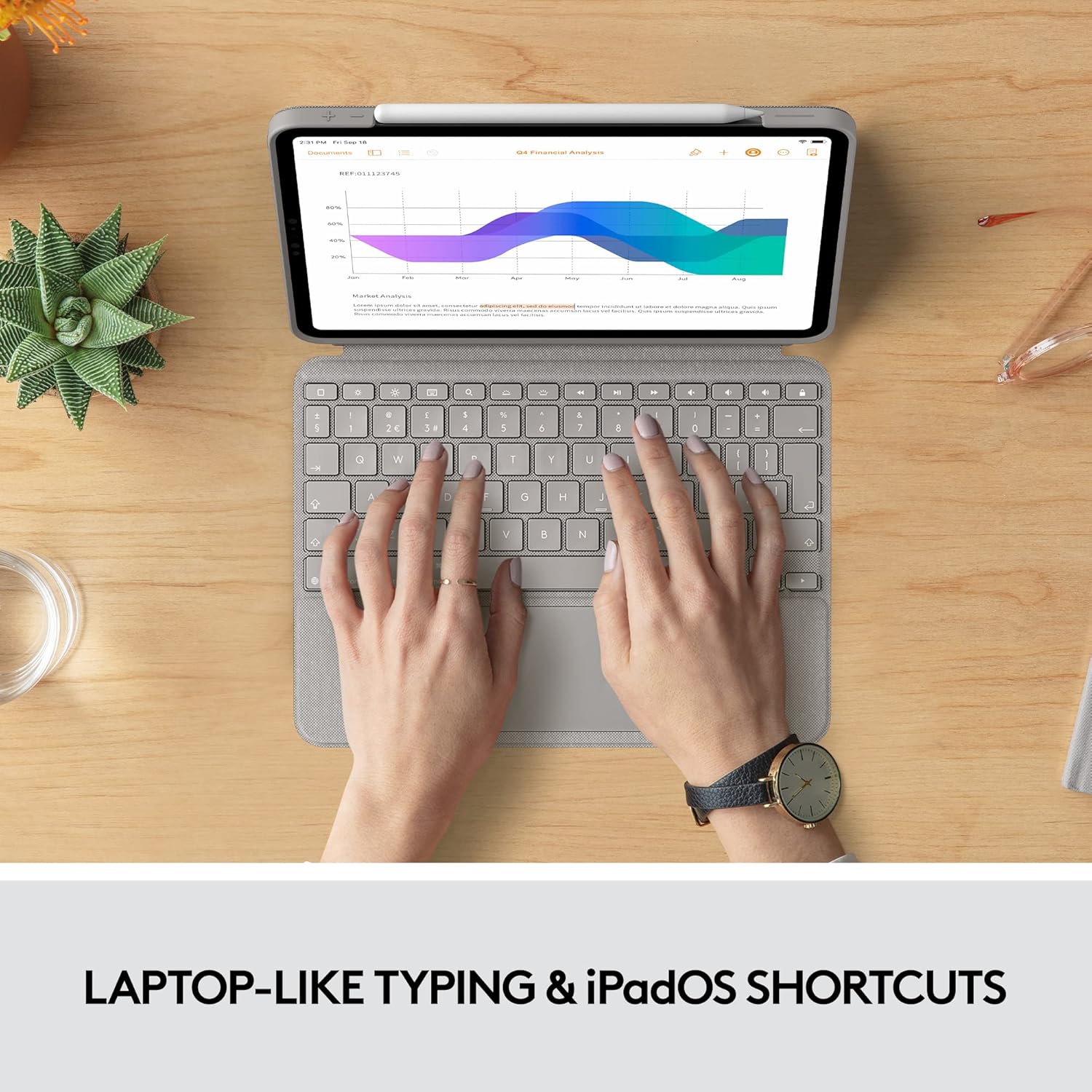 Logitech Combo Touch Keyboard Case for iPad Pro 11-inch (1st, 2nd, 3rd and 4th generation - 2018, 2020, 2021,2022) This is not a laptop. It’s so much more. Meet Combo Touch, the keyboard case with trackpad that enables levels of versatility with iPad Pro. Navigate and work in apps like never before, click-anywhere trackpad — our largest ever* — that gives you more space and allows for Multi-Touch trackpad gestures. SMART CONNECTOR technology helps to deliver an incredibly responsive trackpad experience and also makes powering and pairing the keyboard instant. Type comfortably for hours with laptop-like backlit keys that automatically adjust to your environment. You can always see what you're typing thanks to 16 levels of brightness. Enjoy convenient access to volume controls and more with a full row of iPadOS shortcut keys. The iPad Pro meets its aesthetic match with a slim, sleek design — the thinnest keyboard case we've ever designed with a trackpad.* The elegant woven outer fabric feels as great as it looks and the case is molded to fit your iPad Pro, protecting the front, back, and corners from scrapes and bumps. Your iPad Pro is held securely in place so you can have peace of mind that it won’t slip out and focus on what matters most — getting things done. *Compared to Logitech keyboard cases with trackpad released in 2020. Product Details: System Requirements: iPad Pro 11-inch (1st, 2nd, and 3rd generation - 2018, 2020, 2021) iPad Pro 11-inch (3rd gen) - Models: A2377, A2459, A2301, A2460 iPad Pro 11-inch (2nd gen) - Models: A2228, A2068, A2230, A2231 iPad Pro 11-inch (1st gen) - Models: A1980, A2013, A1934, A1979 Platform Compatibility: iPadOS 13.4 or above Dimensions: 9.92 x 7.45 x 0.67 in Weight: 20.25 oz 4 Modes: Type, view, sketch, read Viewing Angles: 10 - 60 degrees.