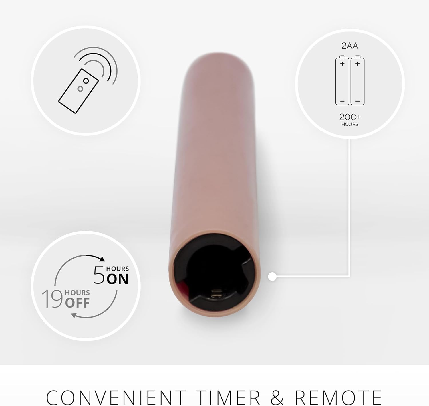 - Powered by 2 AA batteries (not included), each candle offers 200 hours of safe and long-lasting illumination. Set the timer for 5 hours of brilliance, followed by an automatic 19-hour shutdown.