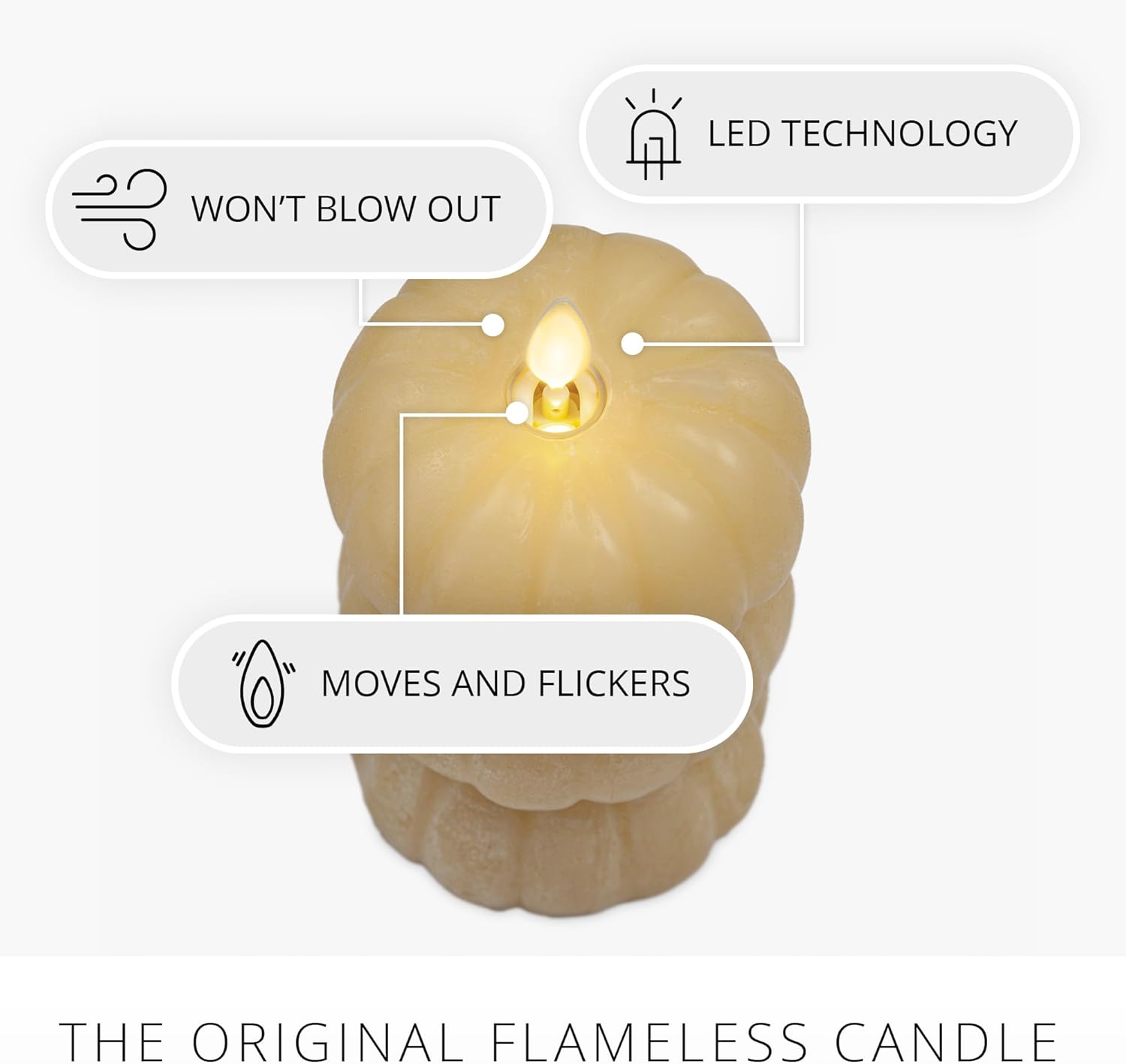 - This flameless candle features three stacked pumpkins in a pale golden husk color with a chalky finish that illuminates with completely safe and romantic candlelight.