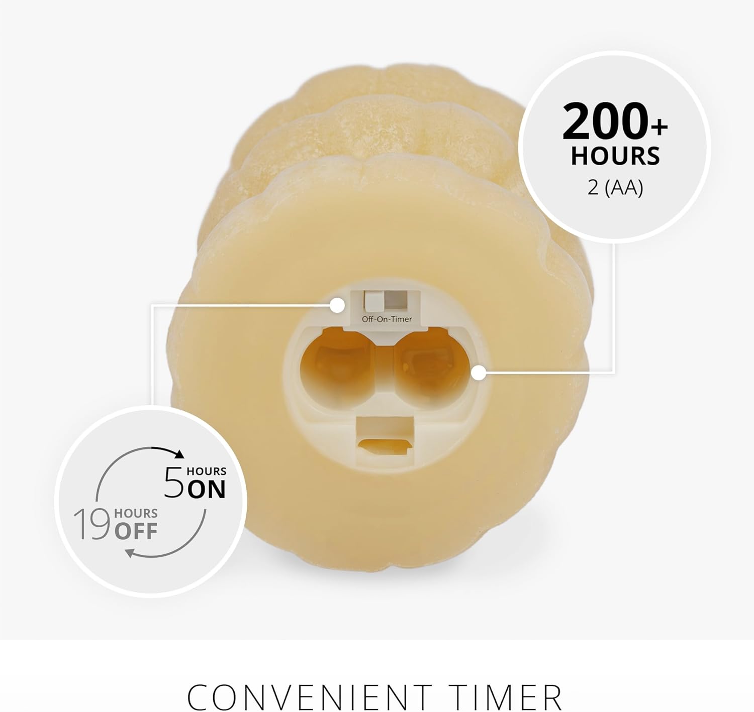 - Powered by 2 AA batteries (not included), each candle offers 200 hours of safe and long-lasting illumination. Set the timer for 5 hours of brilliance, followed by an automatic 19-hour shutdown.
