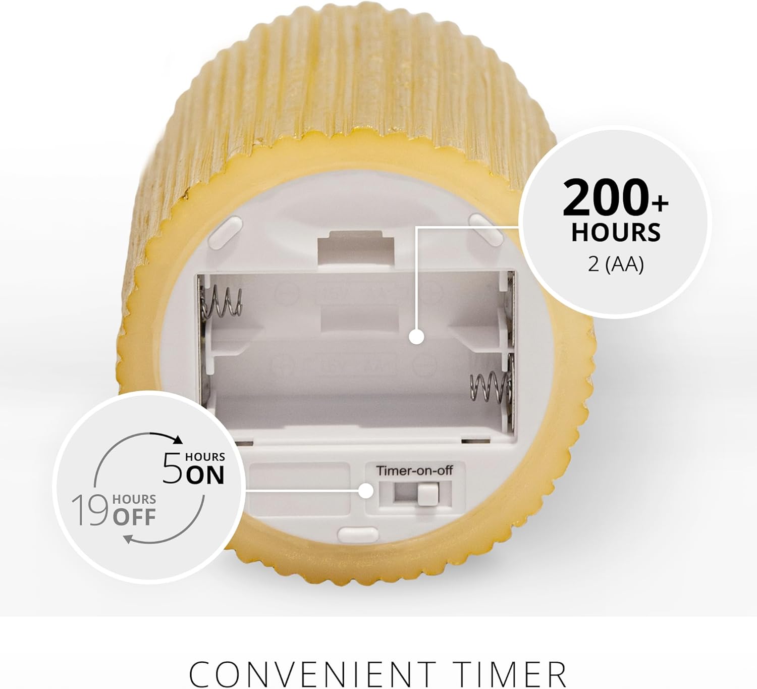 - Each candle takes 2 AA Batteries (purchase separately). When using the timer function, the candle will light up for 5 hours, and then automatically shut off for 19 hours. Candles can provide up to 200 hours of runtime before needing to replace the batteries. With proper care, these flameless candles will provide years of lovely, safe illumination.