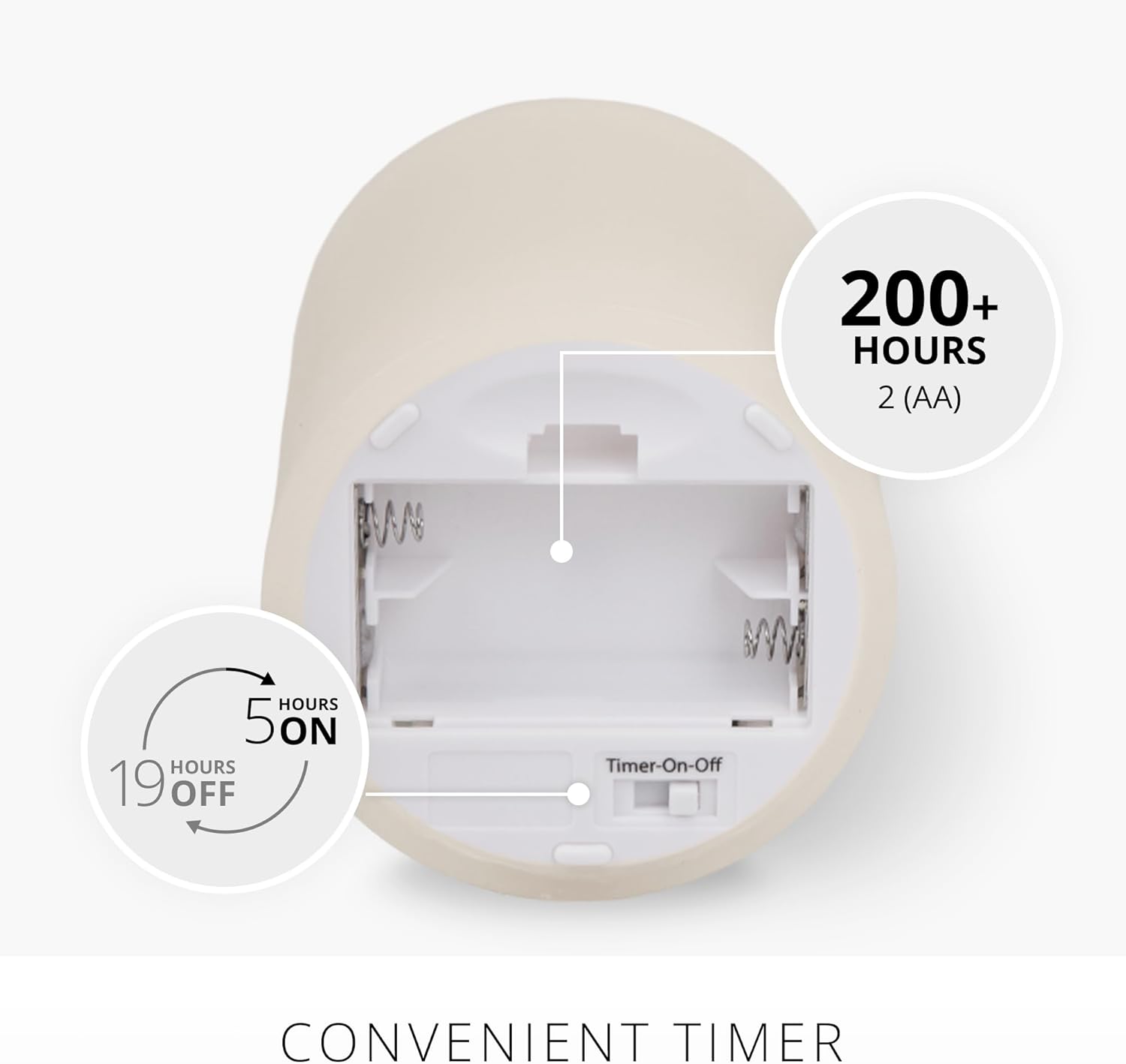 - Powered by 2 AA batteries (not included), each candle offers 200 hours of safe and long-lasting illumination. Set the timer for 5 hours of brilliance, followed by an automatic 19-hour shutdown.