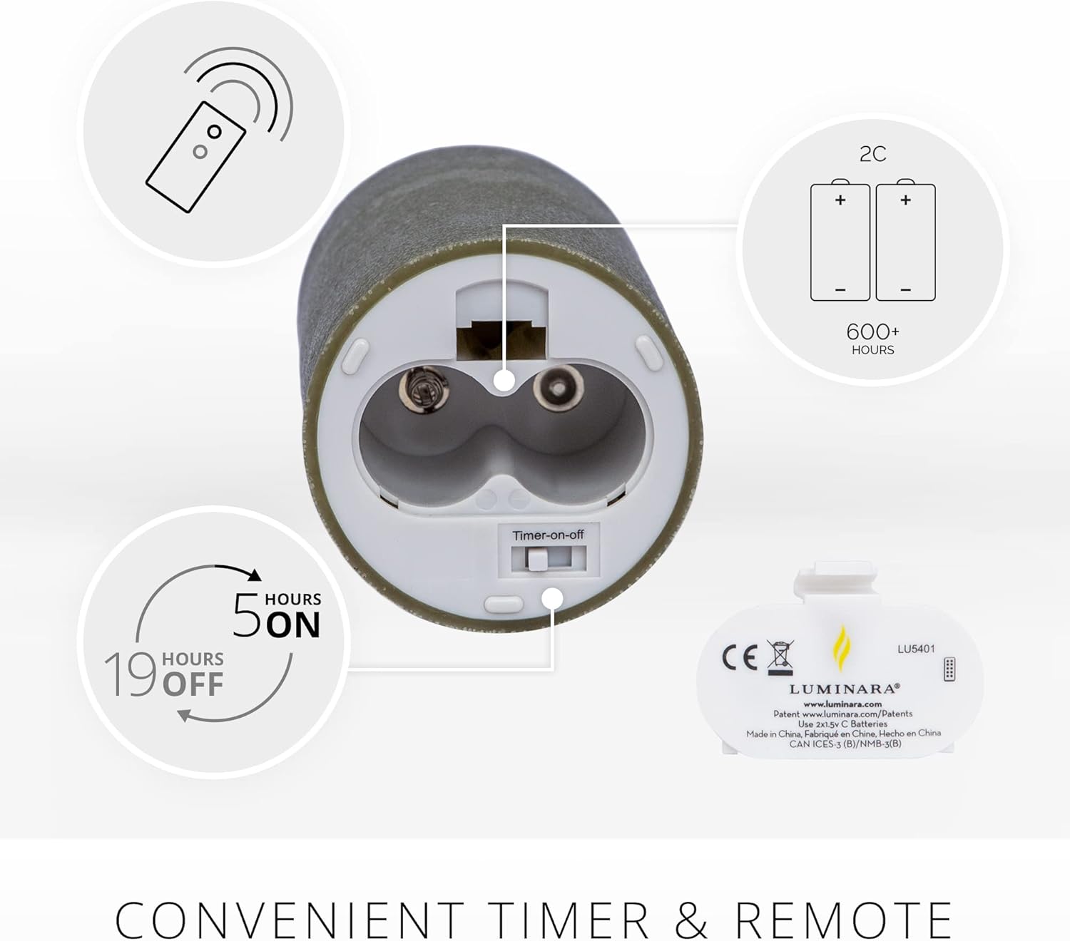 Never have to worry again with Luminara flameless candles since no actual combustion or wax consumption happens. That means no soot or chemicals are released into the air, making them perfect for use indoors. They're perfect for households with small curious children and pets. Get your limited-edition Luminara holiday season flameless candles early. Enjoy these chalky finish candles infused with the holiday spirit. Luminara Real Flame-Effect Seasonal Candles are realistic-looking candles creating a serene effect anywhere you want it without risking your family's safety. A "melted" top highlights the realistic flame that flickers just like genuine candlelight. Use this pillar to illuminate your favorite home decor pieces, like picture frames or antique books. These candles won't blow out ensuring a secure environment and endless decorating possibilities!