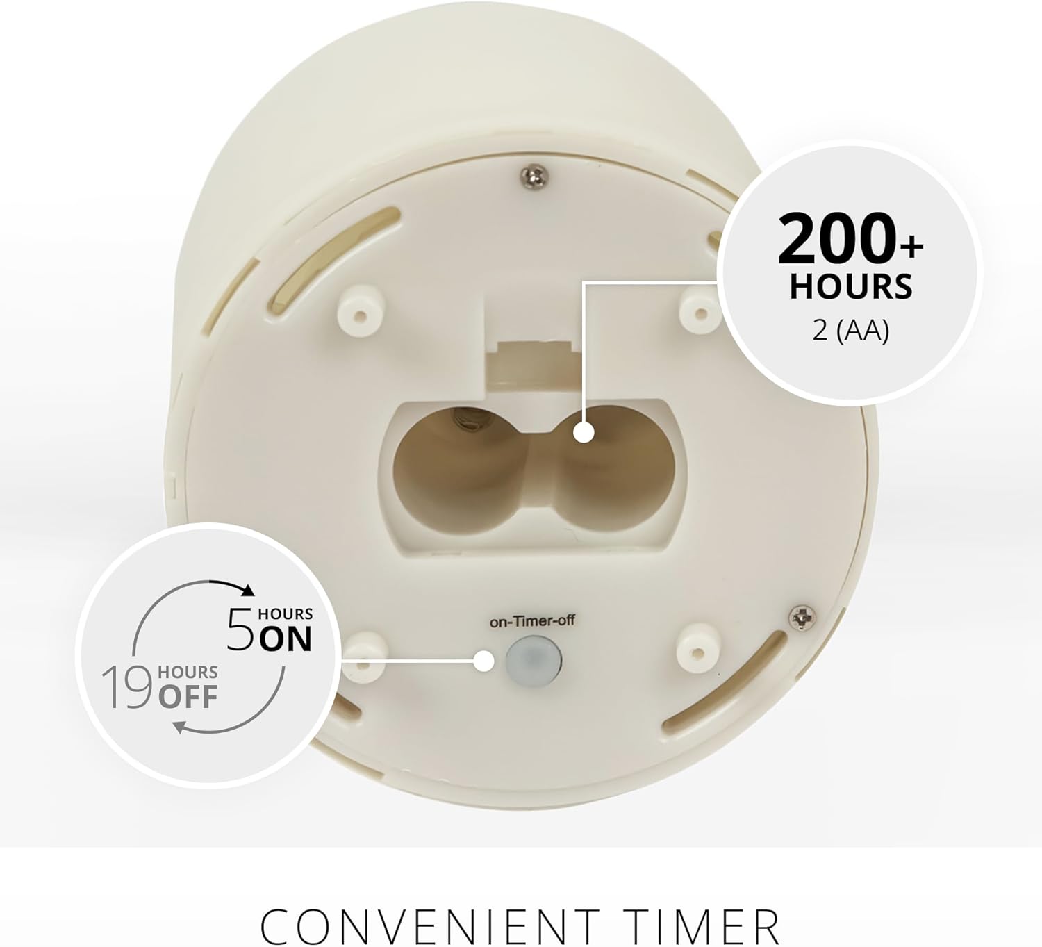 - BATTERY OPERATED WITH TIMER: This style of pillar candle takes 2 AA batteries (sold separately), providing up to 200+ hours of illumination. The convenient automatic timer function is compatible with all Luminara remote controls for easy operation. With the bottom switch, turn the candle on, off, and Timer. When on the timer setting, it will switch off after 5 hours, then turn back on again at the original time, 19 hours later.