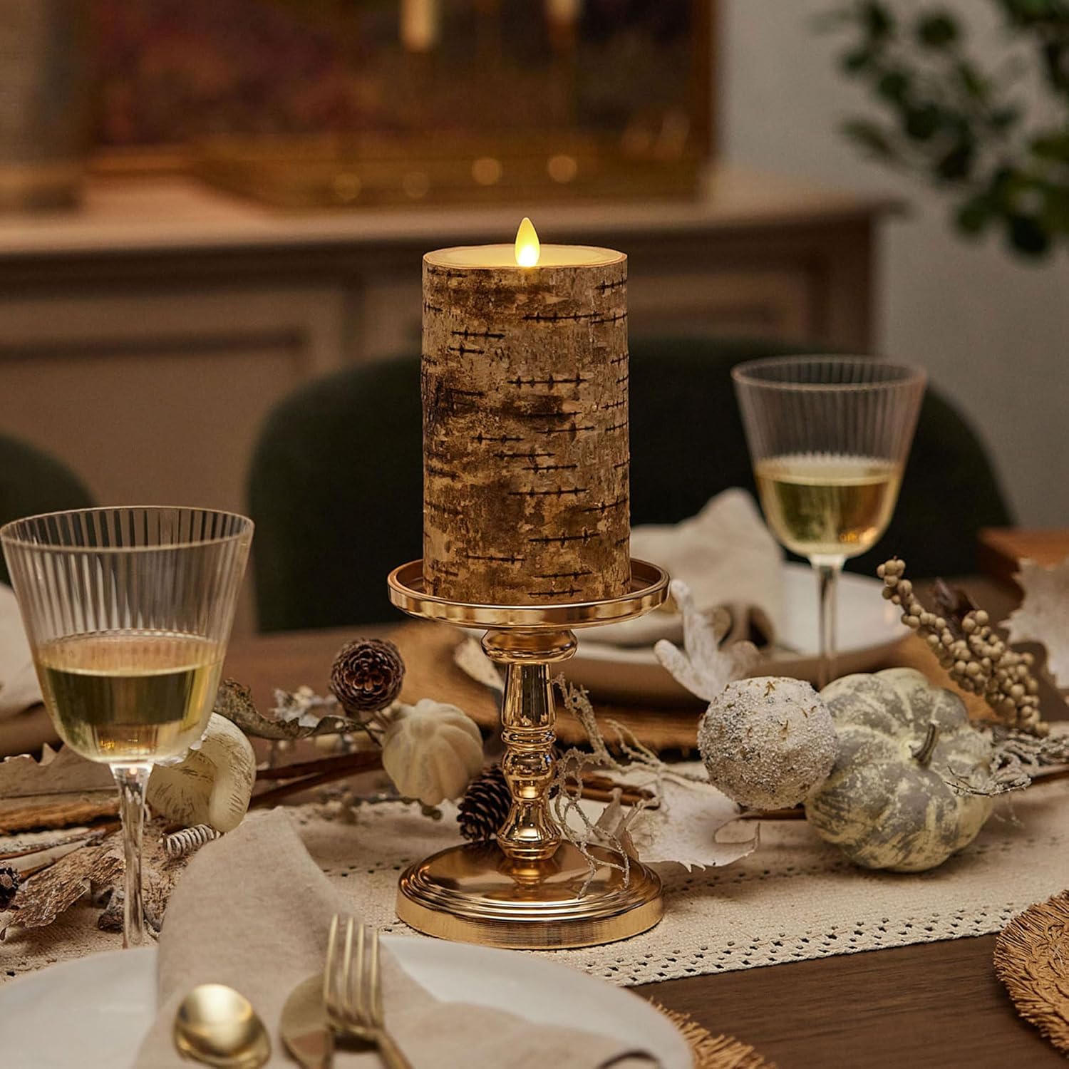 - Wrapped with real bark, this flameless candle is perfect for bringing the outdoors indoors! Measuring 3.5"x6.5", it's perfect for the whole year, but really stands out during the winter holidays, like Christmas. This style of flameless candle is capable of being operated by a remote (sold separately). It is turned on and off by a switch on the bottom, which also activates the timer.