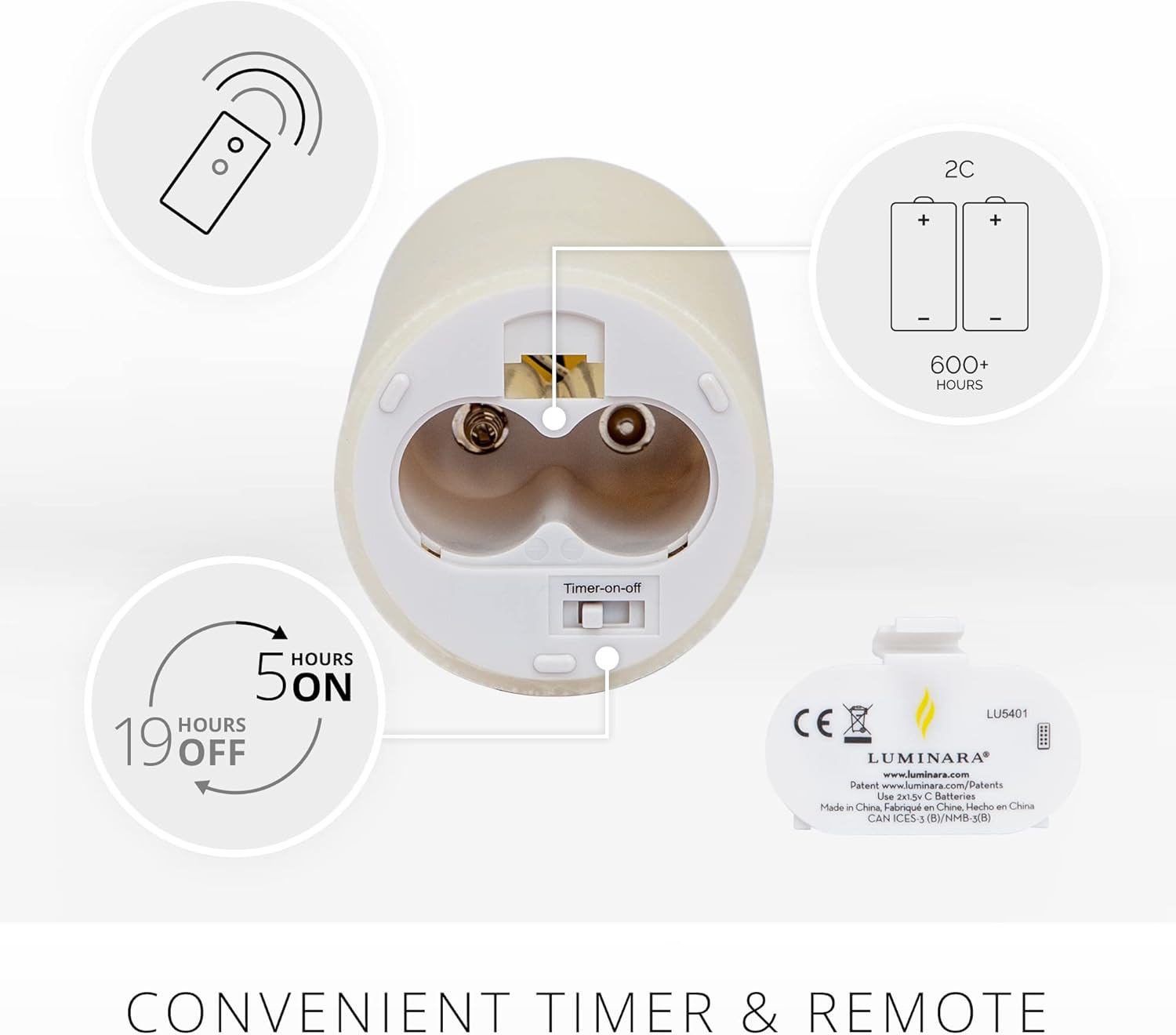 Experience the cozy, unmatched beauty and safety of the Luminara Real-Flame Effect Pillar Candle, Model 993596. This beautiful pillar is crafted from 100% pure, hand-poured paraffin wax with a traditional Ivory finish, designed to provide a stunningly authentic candlelight experience. Utilizing a highly energy-efficient 3 Volt LED light source, this indoor-use candle features Luminara's patented moving flame technology, making the warm white light flicker and move with such realism that it rivals a traditional flame, perfect for any interior décor style. This versatile piece is available in three sizes (3" x 4.5" H, 3" x 6.5" H, and 3" x 8.5" H – please specify the height of the item you are selling). The candle is powered by two C batteries (not included) and boasts an impressive runtime of 600 hours, offering lasting, year-round illumination. Safety is the core benefit: since no actual combustion or soot is produced, this candle is the ideal choice for indoor use only in areas like the Bedroom, Living Room, or Kitchen, and is completely safe for households with small curious children and rambunctious pets. Operation is easy via a toggle switch on the base, which also activates the convenient built-in 5-hour timer function (5 hours on, 19 hours off). For added flexibility, the candle is Remote Control capable via IR Connectivity (remote sold separately). Its matte finish, lightweight design (0.61 lbs for the 4.5" size), and sturdy packaging make it an excellent, easy-to-wrap present for any occasion, from holidays and birthdays to hostess gifts, ensuring years of safe and lovely illumination.