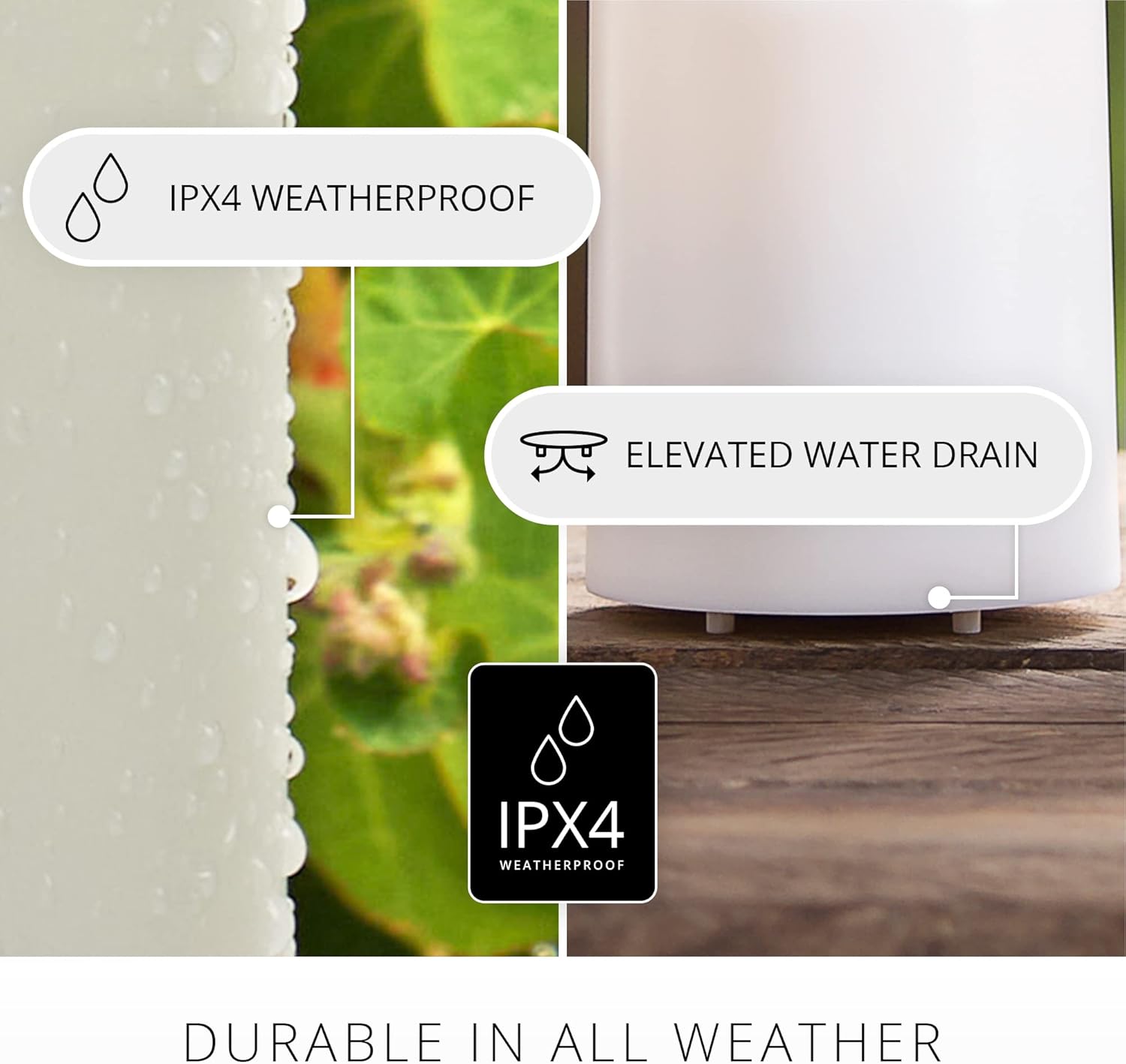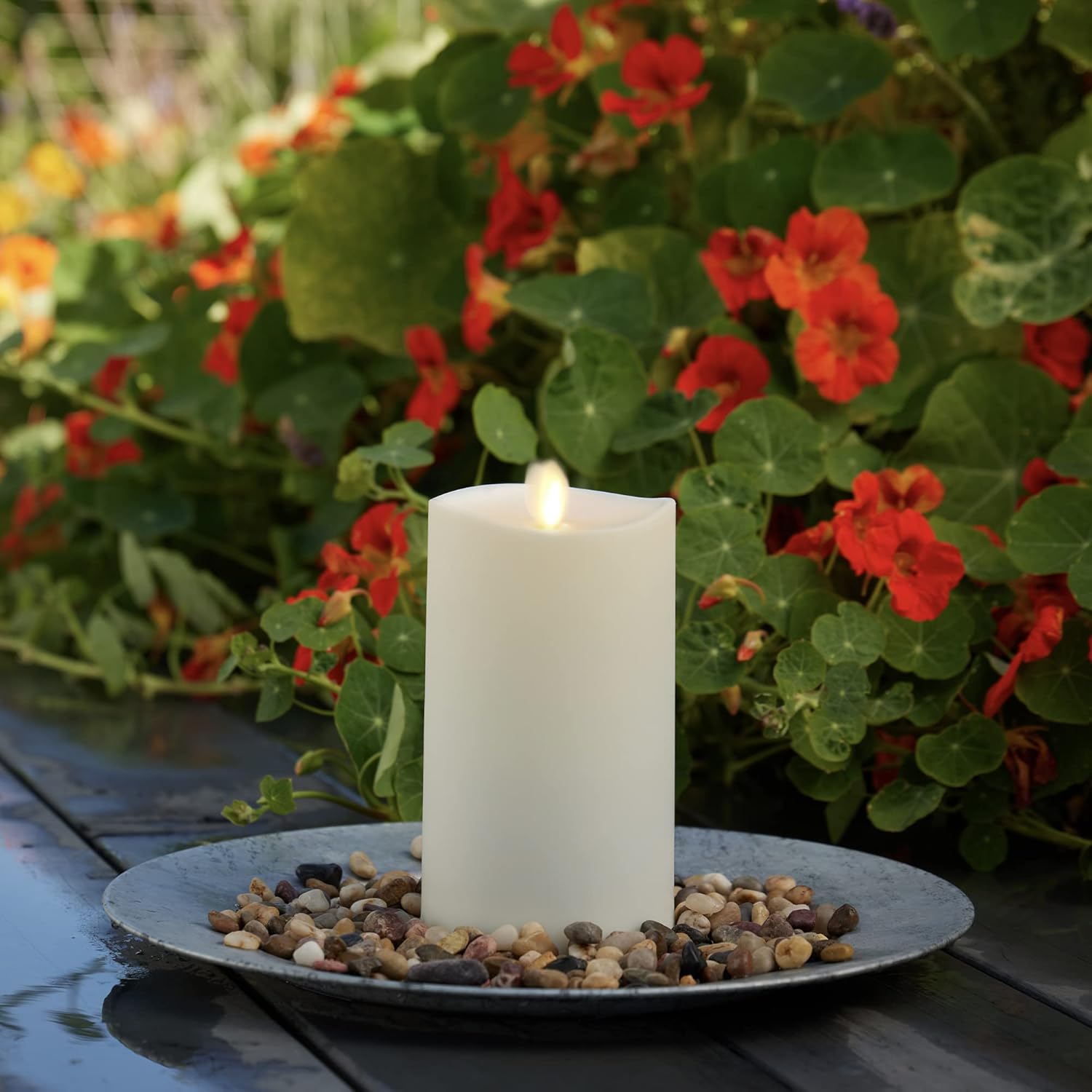 - Luminara Flameless LED Moving Flame Outdoor Pillar Candles are IPX4 Waterproof and made of plastic with a matte finish. The edge is molded to look like a real candle being burned. They are safer to use than traditional candles, since no actual combustion happens, making them perfect for use outside where you can't monitor them all the time. The candles are weather resistant.