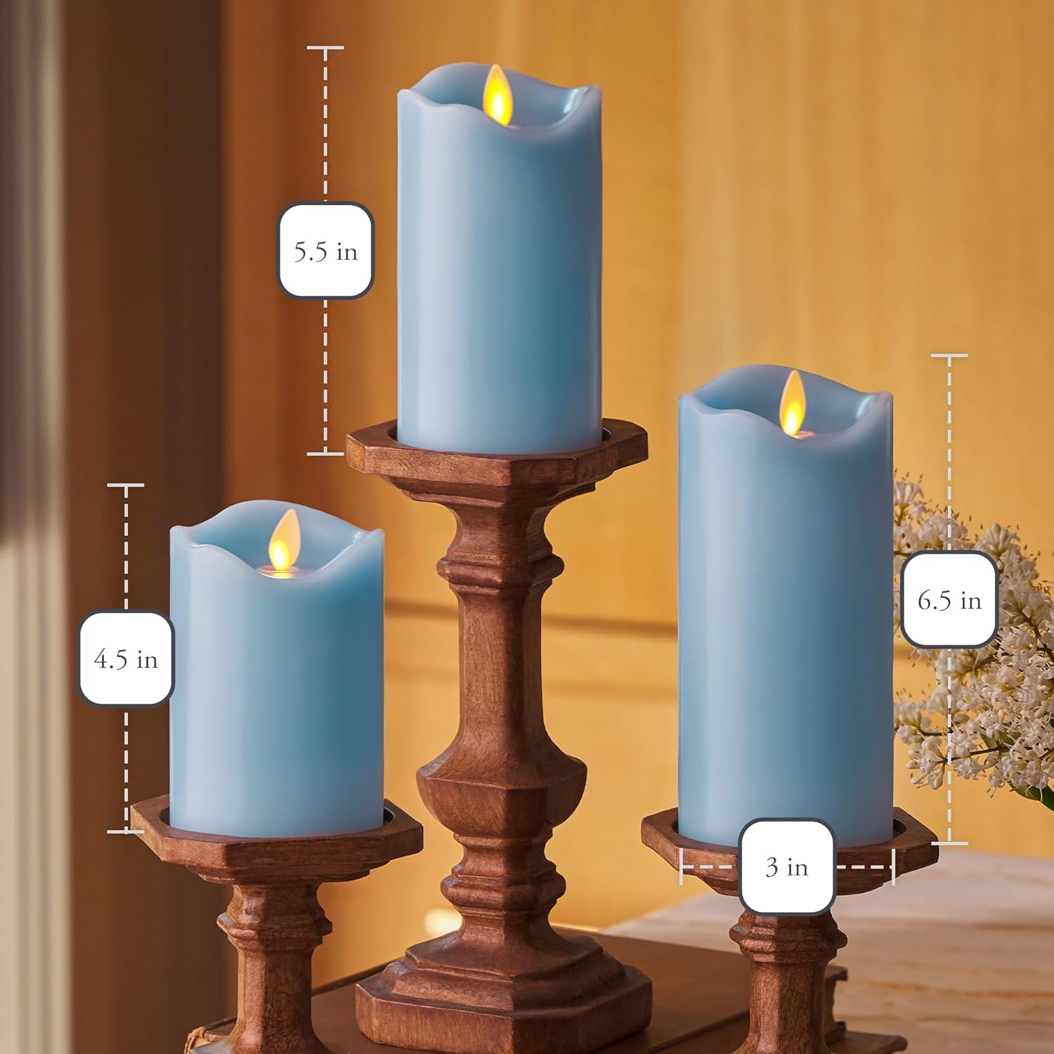 - Enjoy the cozy glow of candles without any of the fuss! These three candles are 3" in diameter each and include a 4.5", 5.5", and 6.5" candle in height. These real flame-effect candles aren't so small they disappear into the background, but not so big they dominate the room. These candles can also be set on the Timer for On/OFF on the bottom.