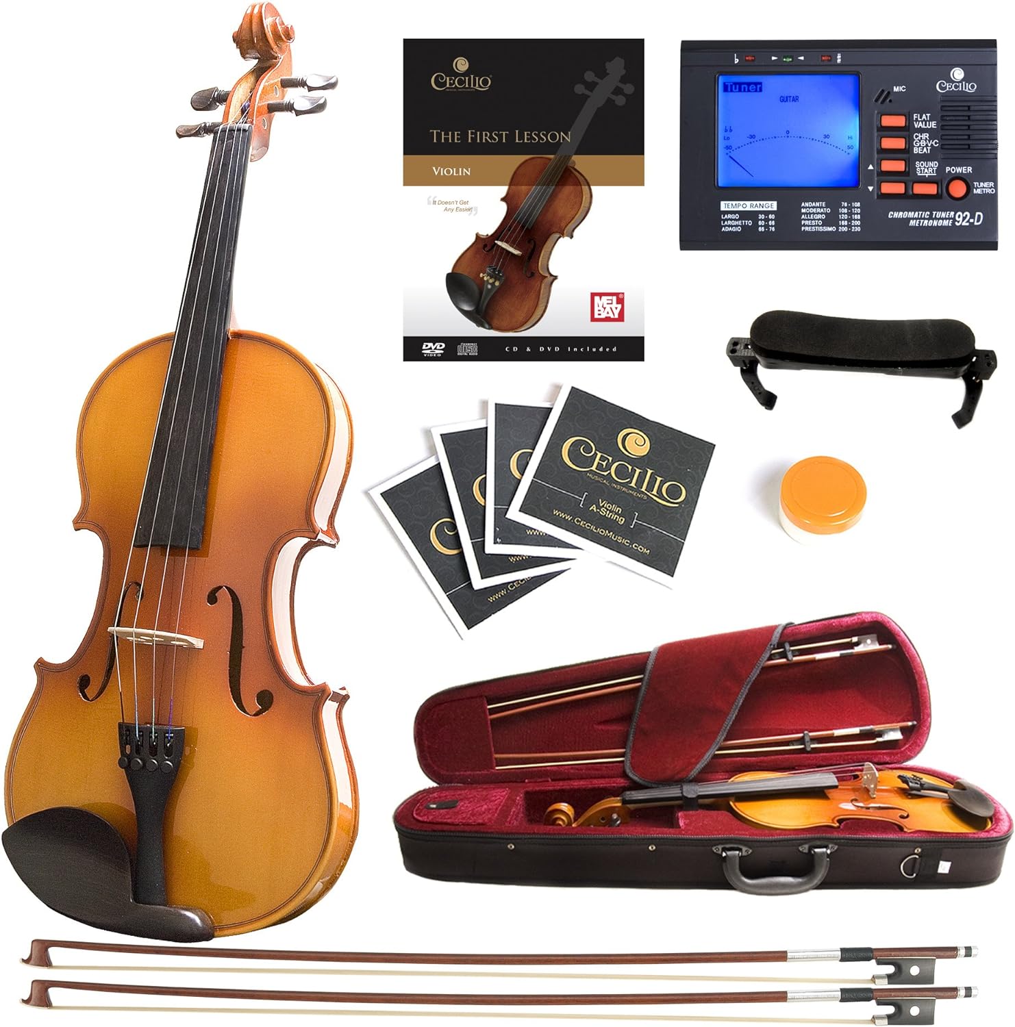 - Our Mendini violin kit also includes a lightweight, hard carry case with backpack and shoulder straps, two Brazil wood bows, two bridges, violin rosin, an adjustable shoulder rest, and additional strings.