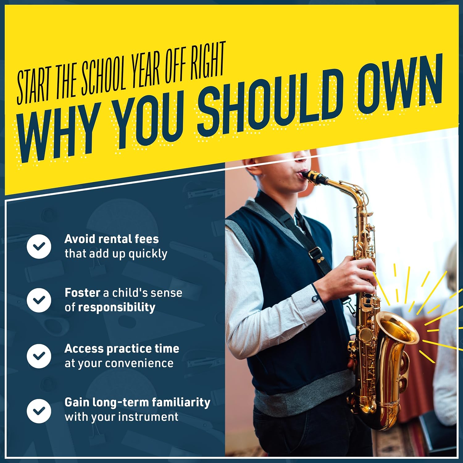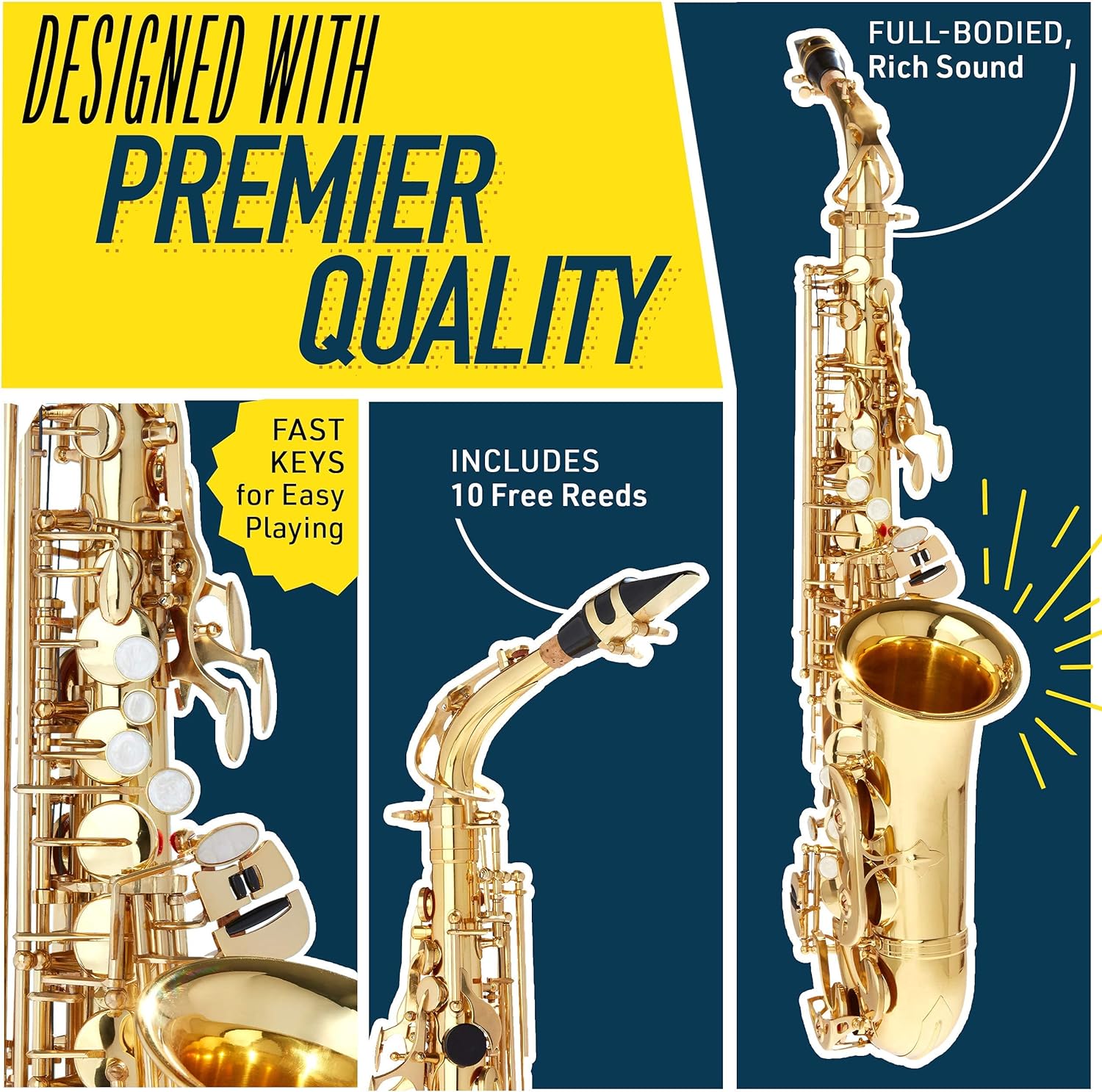 - Includes: Don't just settle for any band & orchestra musical instruments. This complete set includes a pro-deluxe durable hard-shell case, mouthpiece, tuner, neck strap, 10 reeds (Size 2.5 inches), cloth, rod, and a pair of gloves!