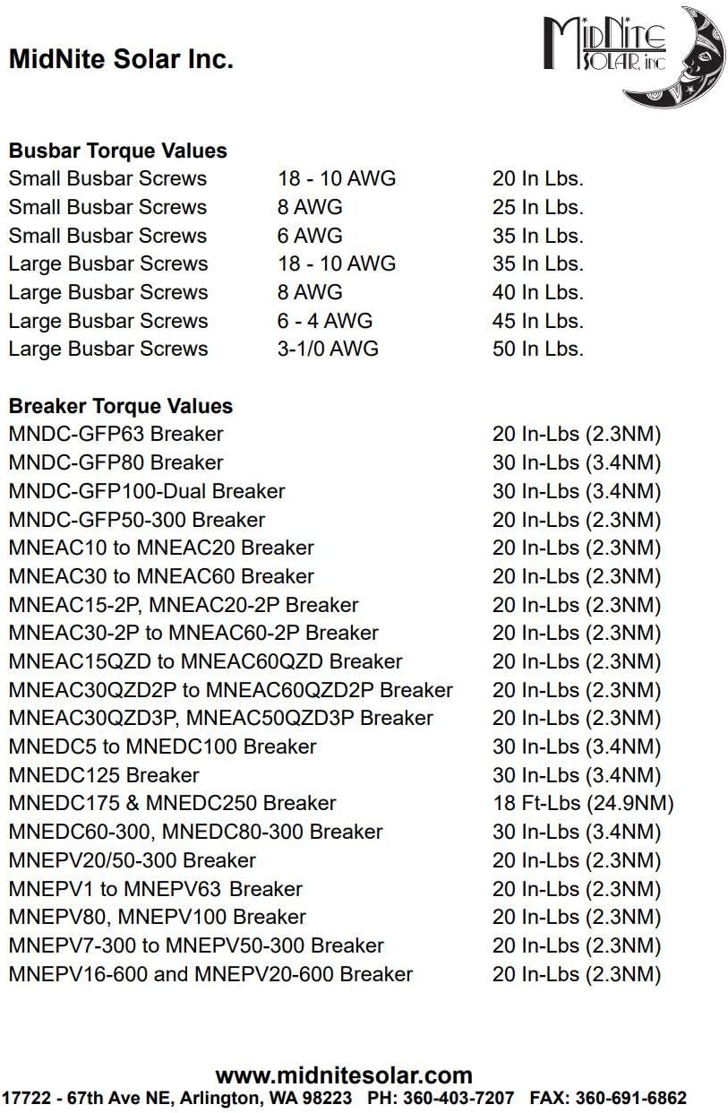 - Breaker Torque Value: 20 In-Lbs (2.3NM)
