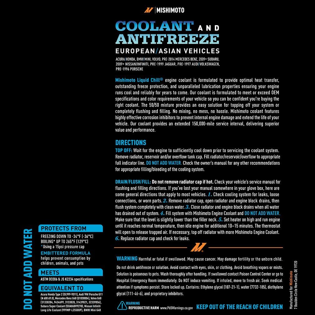 Mishimoto's Liquid Chill Original Equipment engine coolant is formulated with an ethylene glycol base to provide optimal heat transfer, boiling protection up to 265F, freeze protection down to -34F, unparalleled anti-corrosion, and superior lubrication, ensuring your engine runs cool and reliably for years to come. The pre-diluted 50/50 mixture provides an easy solution for topping off your system or complete flushing and filling. No mixing, no mess, no hassle. We offer both universal and color-coded formulas that match your vehicle manufacturer' s specifications to make selecting the right coolant easy. Our coolant provides an extended 5 year/150,000-mile service interval, delivering superior value and performance. This one-gallon bottle of blue coolant is specially formulated to be equivalent to Acura/Honda Type 2, Porsche G11, Mercedes Benz/Volvo/BMW/Mini G48, Subaru Super Coolant, and Nissan/Infiniti Long Life Coolant. It meets ASTM D3306 and JS K2234 specifications for your Acura, Honda, BMW, MINI, Mercedes Benz, Subaru, Nissan, Infiniti, Jaguar, VW, Audi, or Porsche vehicle.
