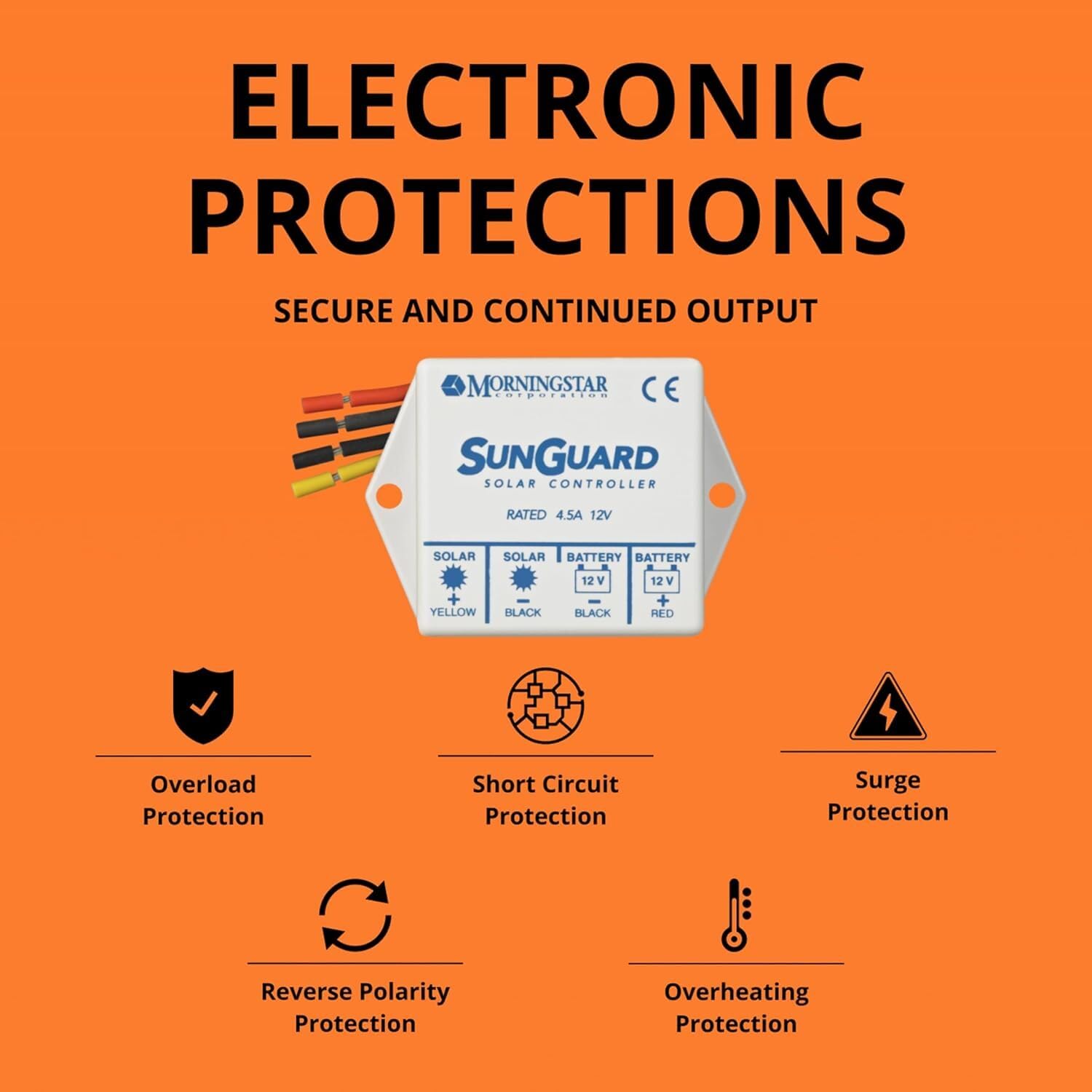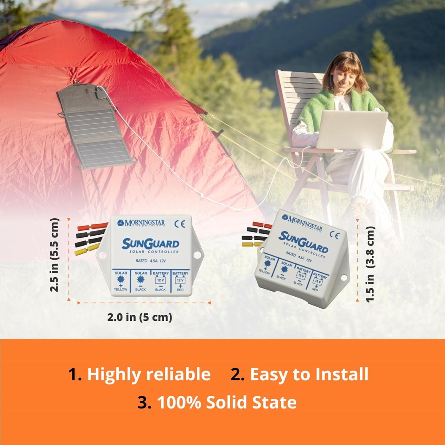 - 4.5A PWM CONTROLLER: Morningstar Sunguard Pulse Width Modulation (PWM) 4.5A solar charge controller delivers reliable charging for smaller solar systems. It regulates power from the solar array that it delivers to the batteries. Benefit from its low self-consumption and high energy harvest.