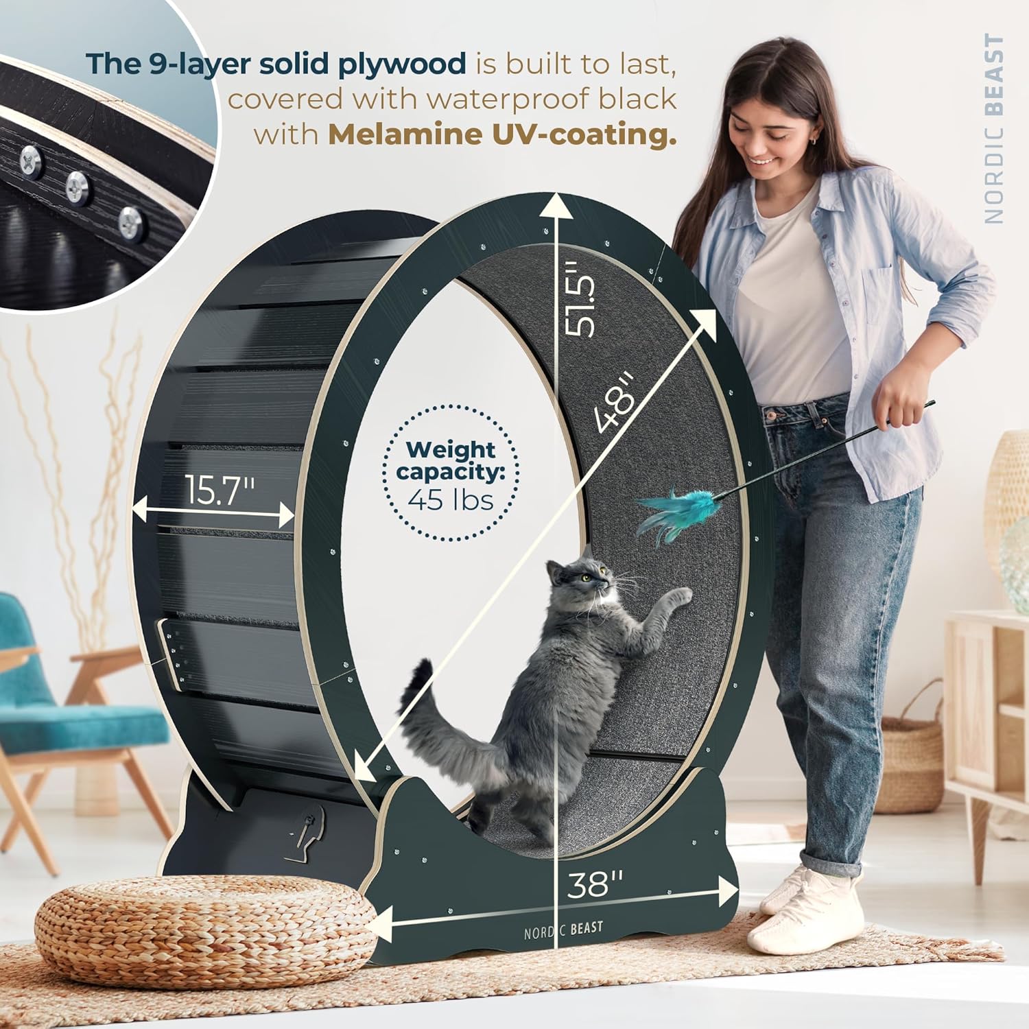 Description: Keep your feline active and healthy with the Nordic Beast large-black-wheel-5 Cat Exercise Wheel. Designed for large cats up to 45 lbs, this 48'' wheel with a 15.7'' wide running surface protects your cat’s spine and paws while providing a fun way to exercise indoors. The durable 9-layer plywood frame with waterproof melamine coating ensures stability and longevity. Noise-free design keeps your home peaceful, while the removable carpet makes cleaning easy. Includes assembly tools, training guide, and feather wand for effortless setup and use. Perfect for all cat breeds and life stages.
