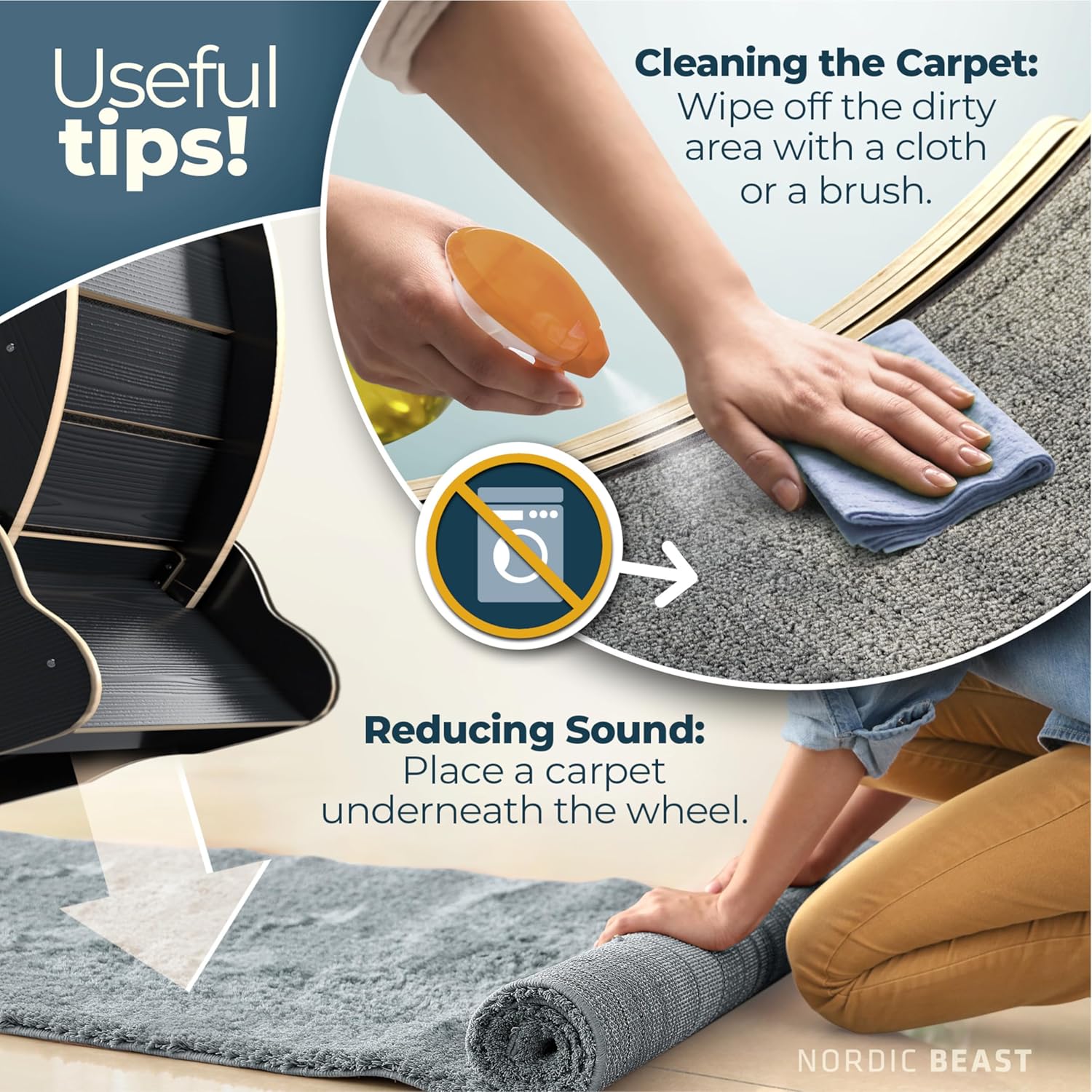 - Noise-Free cat running wheel - Enjoy a quiet workout with this cat treadmill wheel. This large indoor cat wheel is perfect for maintaining a peaceful home environment. The cat wheel carpet can be easily removed for cleaning.