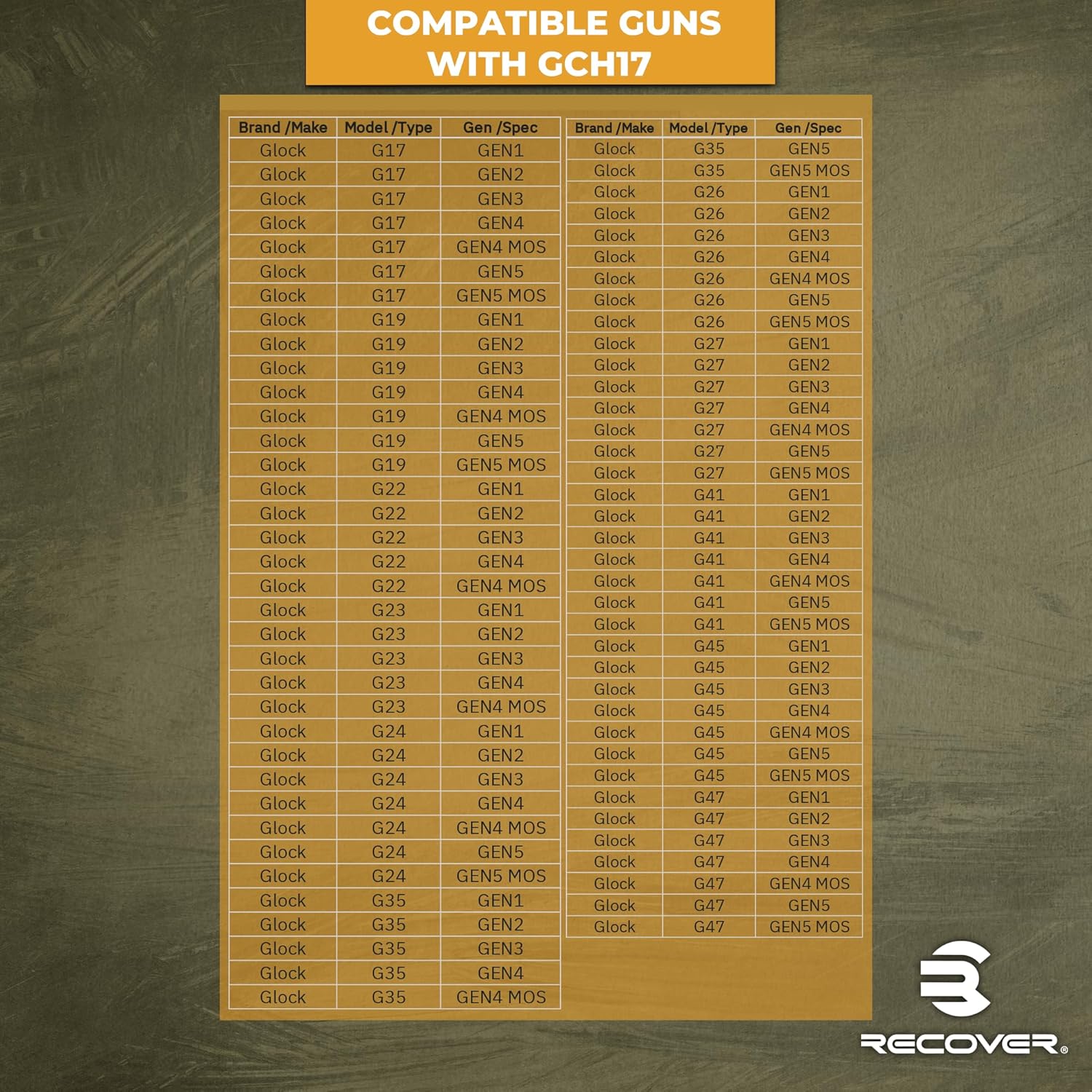 - Compatible with all generations of Glock 17/19/24/26/27/34/35/41/45/47 and with Glock 22/23 Gens 1-4 (Slide Serrations must be straight)