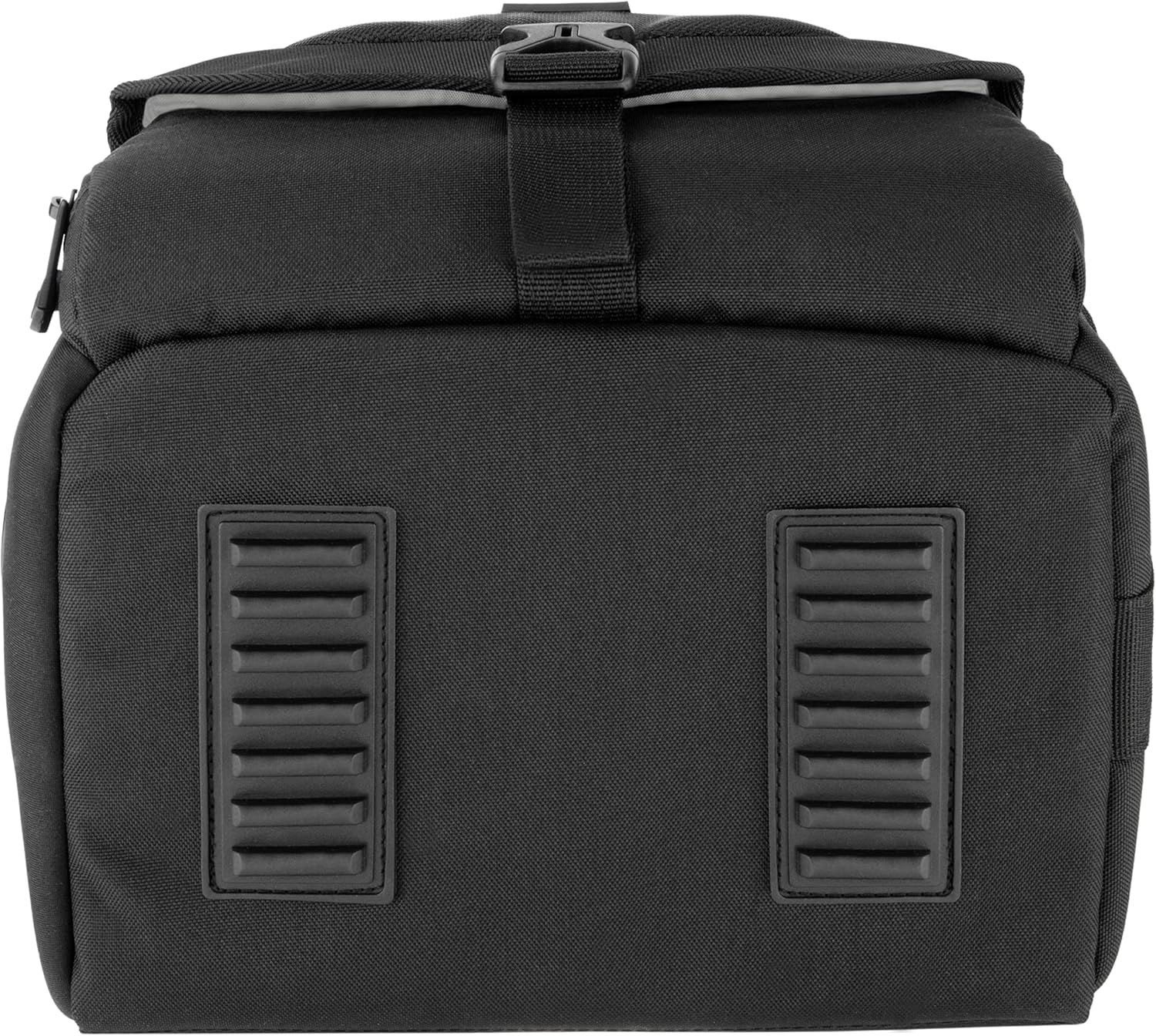 The Journey 34 DSLR Shoulder Bag, in black, from Ruggard stores and protects your compact DSLR or mirrorless camera with an attached lens and grip. It also fits up to two extra lenses and various small accessories. This handsome bag features a large flap with a quick release buckle, and double-pull zipper closure. The main compartment has four padded, touch-fastening dividers for organizing equipment. A light gray interior lining makes it easier to locate gear in low light. Under the lid is a large, zippered, mesh accessory pocket. Small accessories are easily accommodated in the front exterior zippered pocket. Inside this pocket are two slip-in pockets, two memory card pockets with touch-fastening flaps, and a zippered mesh pocket. Photographers will appreciate the neoprene water bottle/accessory pocket located on the exterior left side of the bag. On the opposite side is a strap for attaching accessories. Carry the Journey 34 Shoulder Bag by the padded top handle, or wear with the removable, adjustable, padded shoulder strap. The strap has swiveling snap-hooks that attach to metal D-rings on either side of bag. And on the back of the bag is a trolley strap that comes in handy when traveling with rolling luggage.
