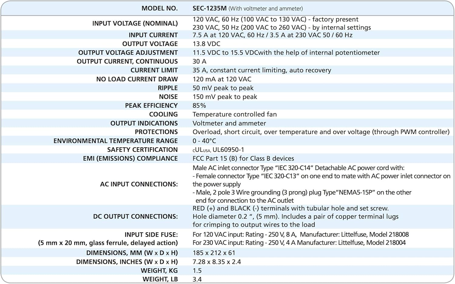 This high efficiency UL-60950-1 approved AC-DC power converter provides a highly regulated output DC voltage of 13.8 Volts at 30 Amps with an AC input of 120 Volts, 60 Hz (230 Volts, 50 Hz possible by internal jumper setting). These advanced switch-mode DC power supplies were designed specifically for land mobile radio applications. The power supplies produce clean reliable power and are highly filtered to suppress RFI. The unit comes with front panel ammeter and voltmeter and a detachable power supply cord with NEMA 5-15P plug. Features include over-load, short-circuit, and over-temperature protection. The AC-DC power supply conforms to FCC Part 15(B), class B digital device.