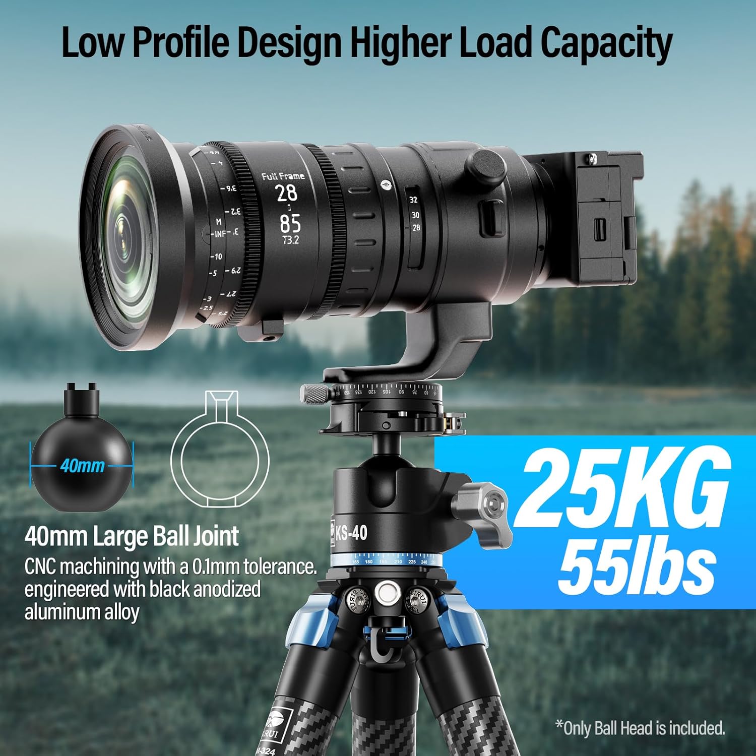 - 【Low Gravity Ball Head】 Strong aluminum tripod head adopts 40mm diameter ball. 55mm Large base diameter increases the contact surface with the tripod, low gravity design reduce the distance between center of gravity and the base, which provide better stability and higher load capacity to support DSLR cameras, mirrorless cameras, camcorders, and other equipment weighing up to 25kg.