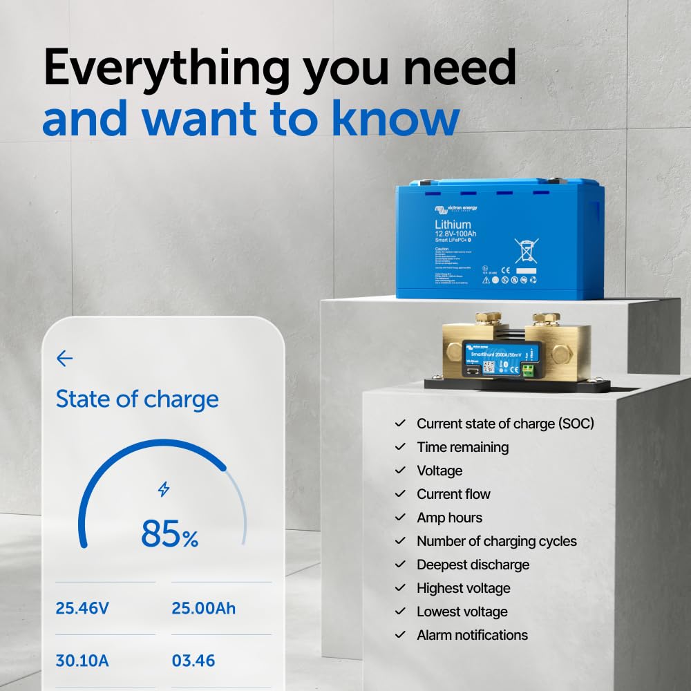 - DETAILED IN-APP INSIGHTS: Battery monitor data is conveniently presented in the VictronConnect app on your smartphone. Instant readout enables you to see all important data at a glance, at any moment, without having to wait on Bluetooth pairing. Alarm notifications will inform you of any urgent matters.