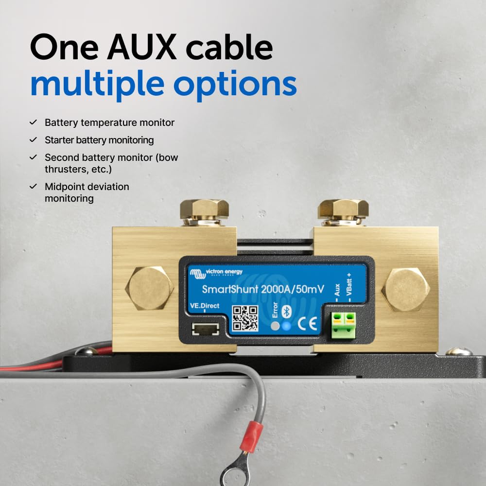 - AUXILIARY CONNECTIONS: The Aux cable connection can be used for different applications; as a second battery monitor, to monitor the mid-point or to connect to an optional temperature sensor. The SmartShunt can even be used as versatile DC energy meter.